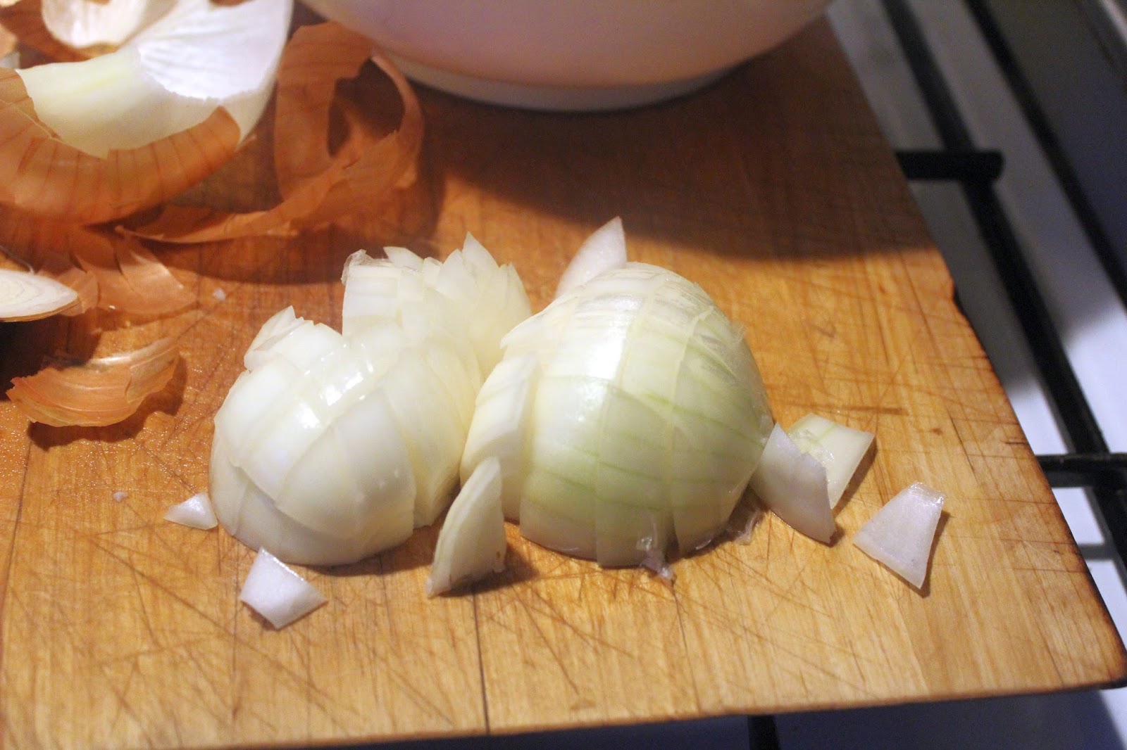 Eine Zwiebel zu Würfeln verarbeiten.