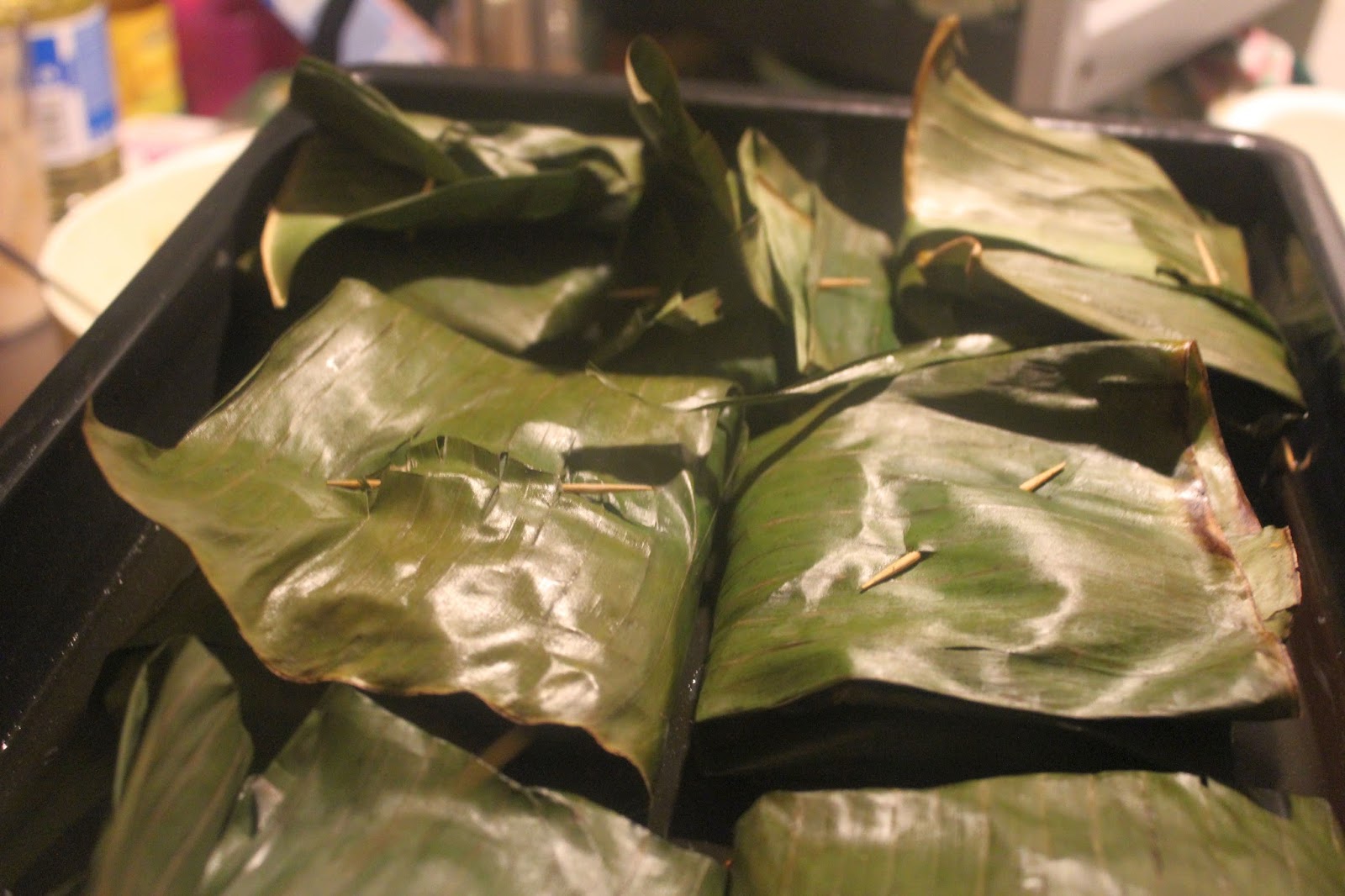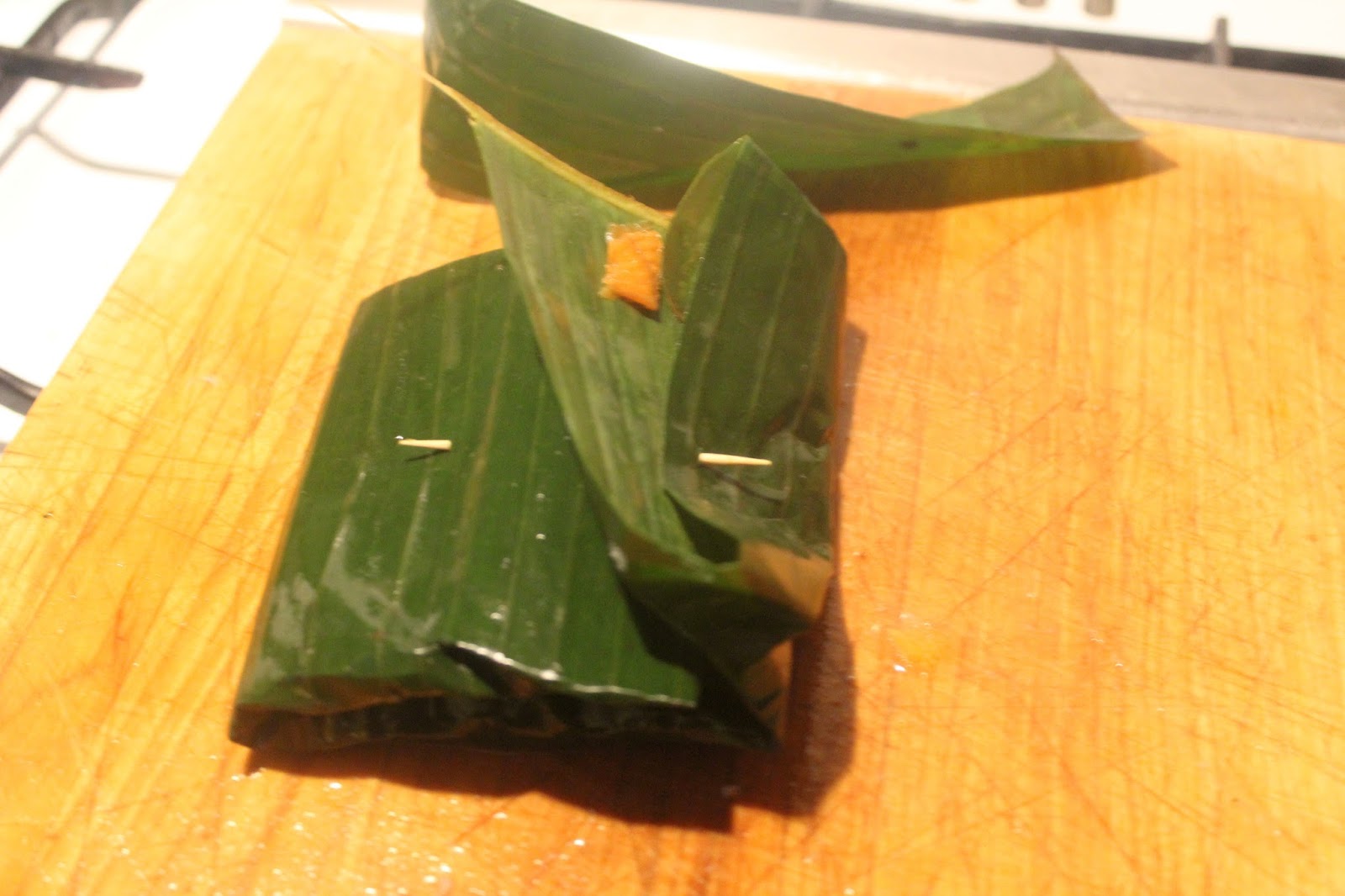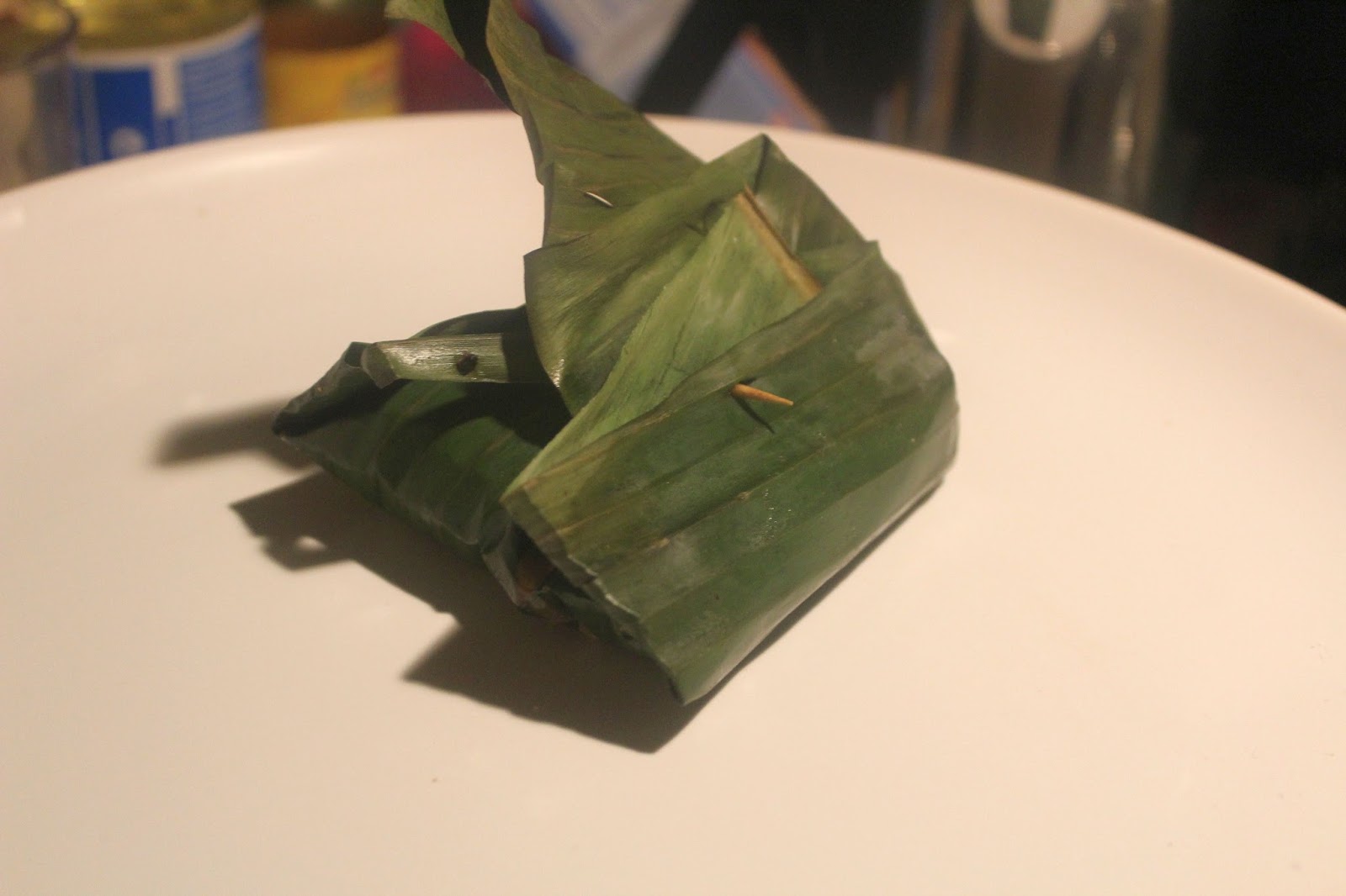 Das eingerollte Bananenblatt dann mit einem Zahnstocher sichern. Das machen bestimmt auch nur Anfänger und in Asien gibt es gar keine Zahnstocher.