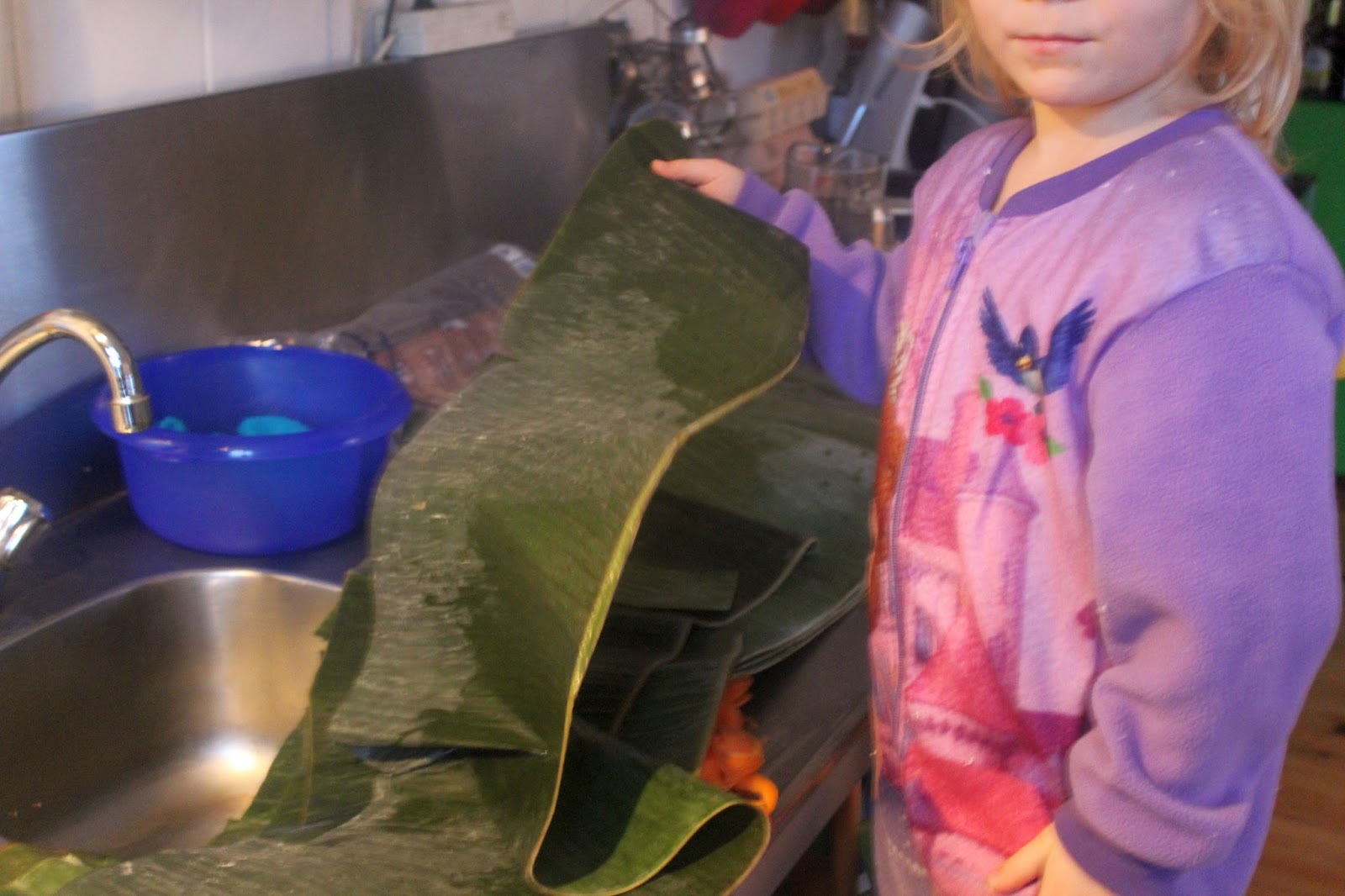 Meine Kinder fanden das auch total spannend, mit Bananenblättern zu kochen. Die Blätter erstmal unter kaltem Wasser abwaschen.