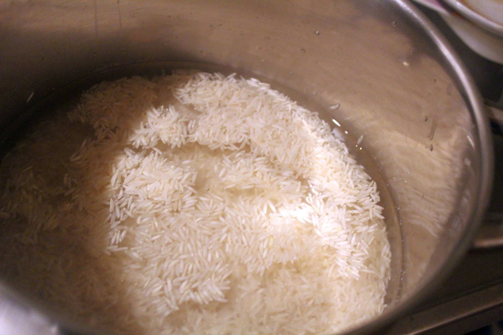 In der Zwischenzeit Basmatireis kochen. Wenn der fertig ist, einfach im Topf mit einem Deckel abgedeckt stehenlassen. Der hält die kurze Zeit warm,. bis das Paket aus dem Ofen kommt.