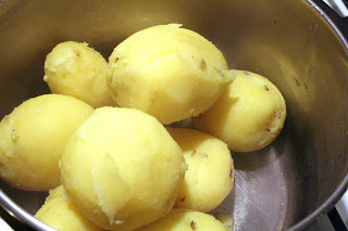 Die Kartoffeln sollten richtig ausgekühlt sein, bevor man sie für den Kartoffelsalat in Scheiben schneidet, oder mit der Standreibe hobelt. Ich habe noch einen draufgesetzt und die Kartoffeln mit meiner Zauberette bearbeitet. Die Kartoffeln werden optimal schon am Vorabend als Pellkartoffeln gekocht. Dann entfällt schon mal das Argument, dass man keine Zeit hatte und einen aus der Kühlung kaufen musste. Die machen sich in 20 Minuten nebenbei, sie müssen vorher nicht geschält werden und am nächsten Tag in kaltem Zustand sind sie ruckzuck gepellt.