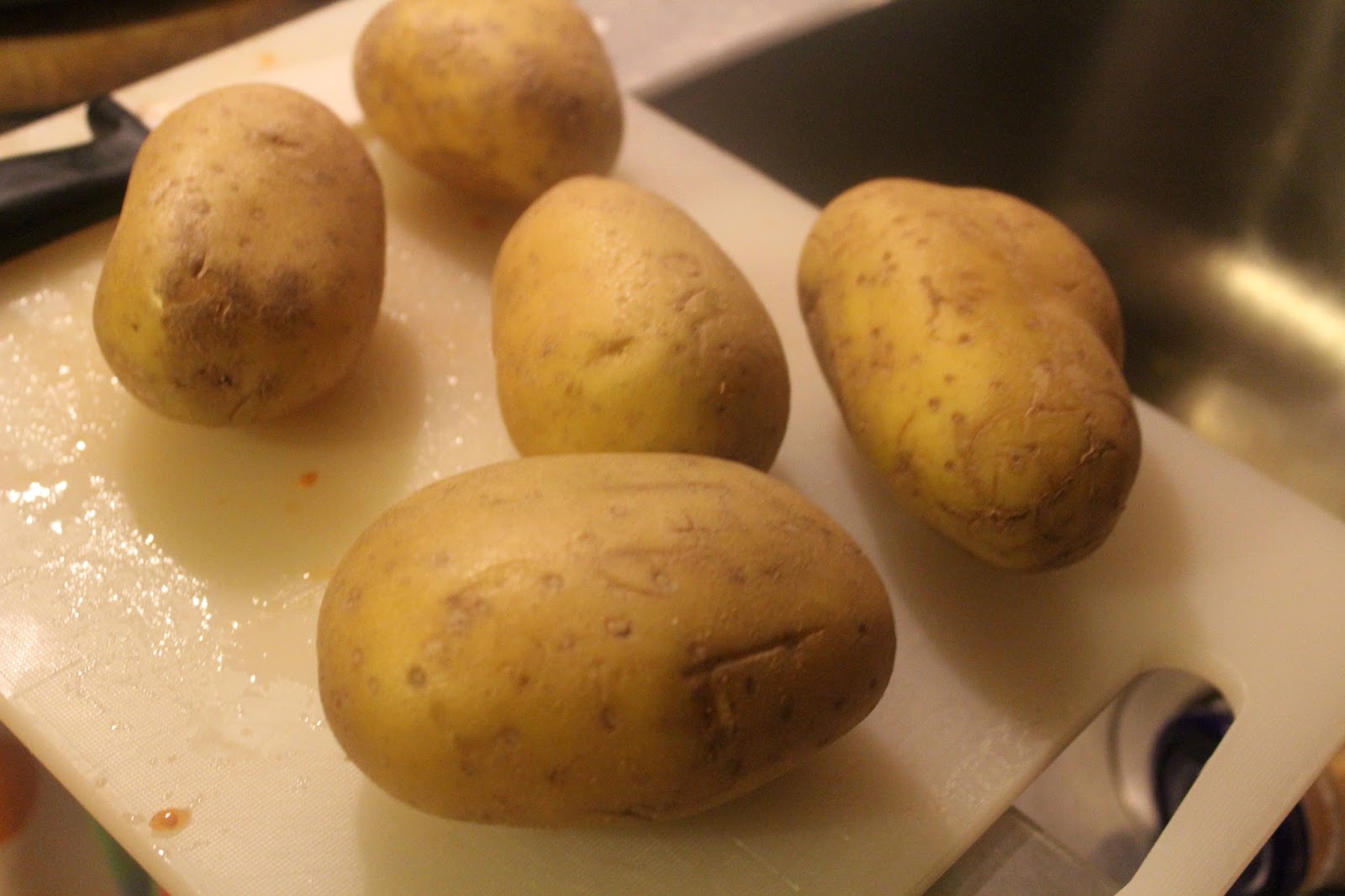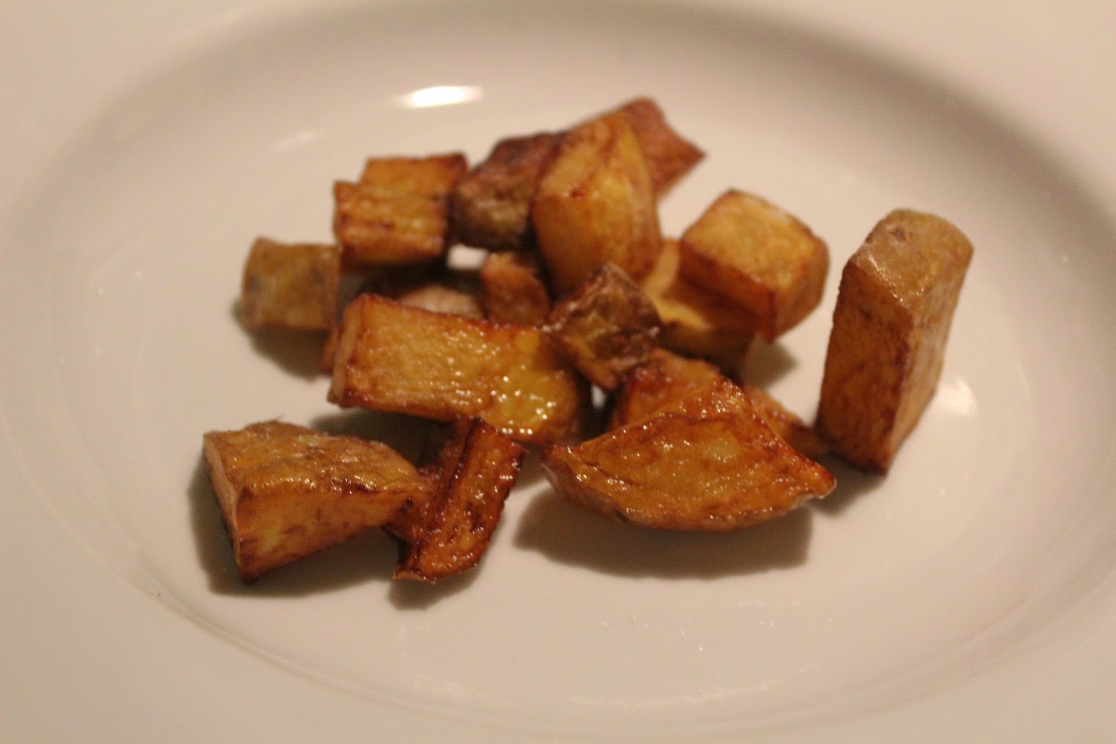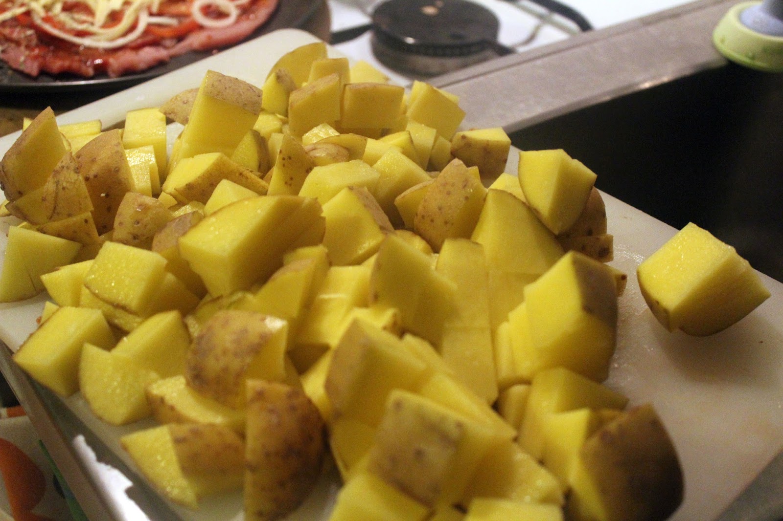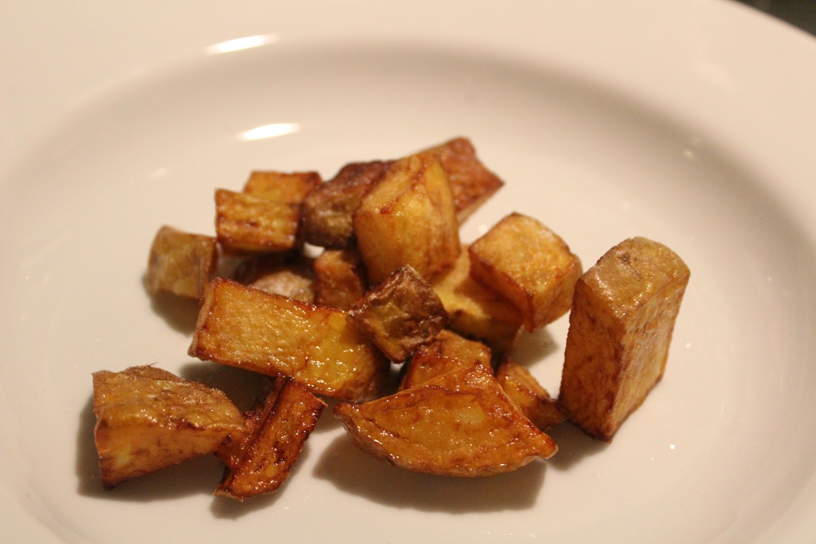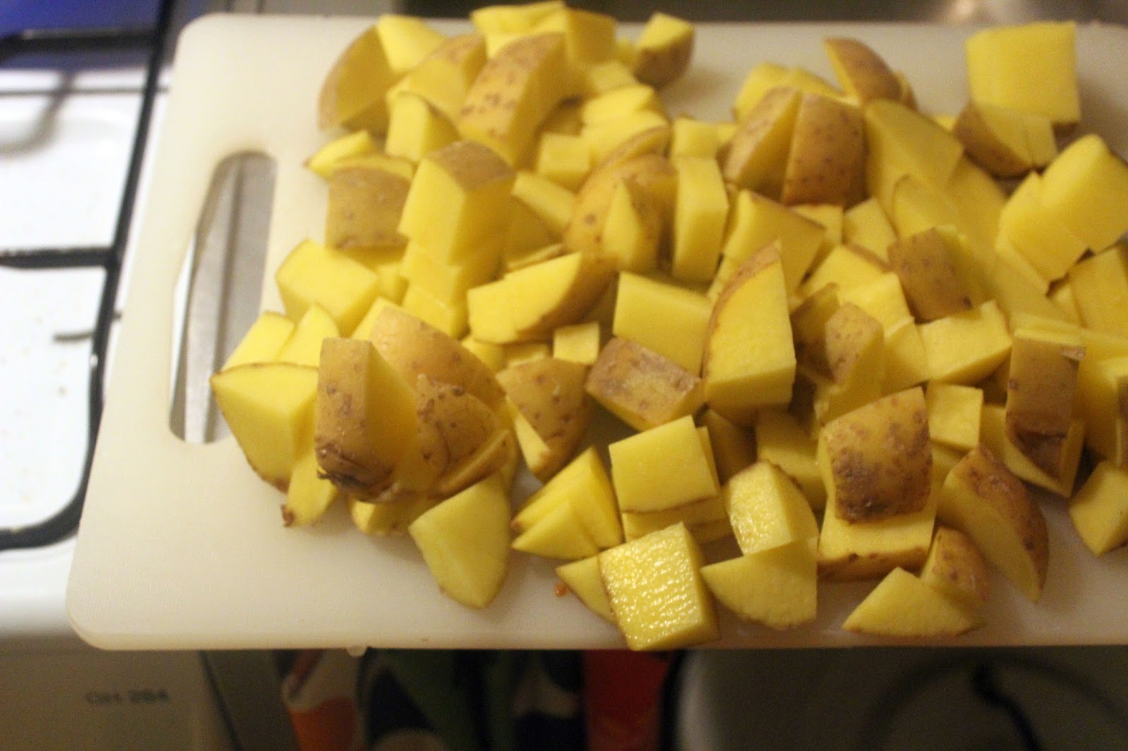 Die echten Cracks wässern jetzt die Kartoffelwürfel noch eine halbe Stunde, um die Stärke aus den Kartoffeln zu bekommen, aber ich kann auch ein Buch darüber schreiben, statt etwas zu essen auf den Tisch zu stellen. Hier ist das Kochen für Doofe, und es ist vor allem wichtig, irgendwas so schnell es geht, so frisch wie möglich zu bereiten, bevor man sich irgendwelchen Fertigschrott kauft.