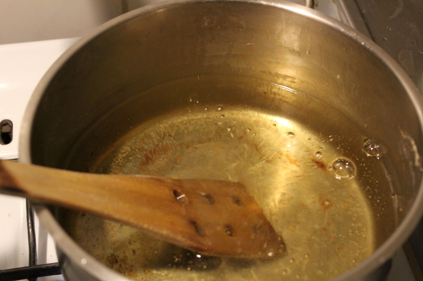 Mit dem Pfannenwender aus Holz ermittelt man die richtige Temperatur. Wenn am Pfannenwender Blasen sprudeln ist das Fett heiß.
