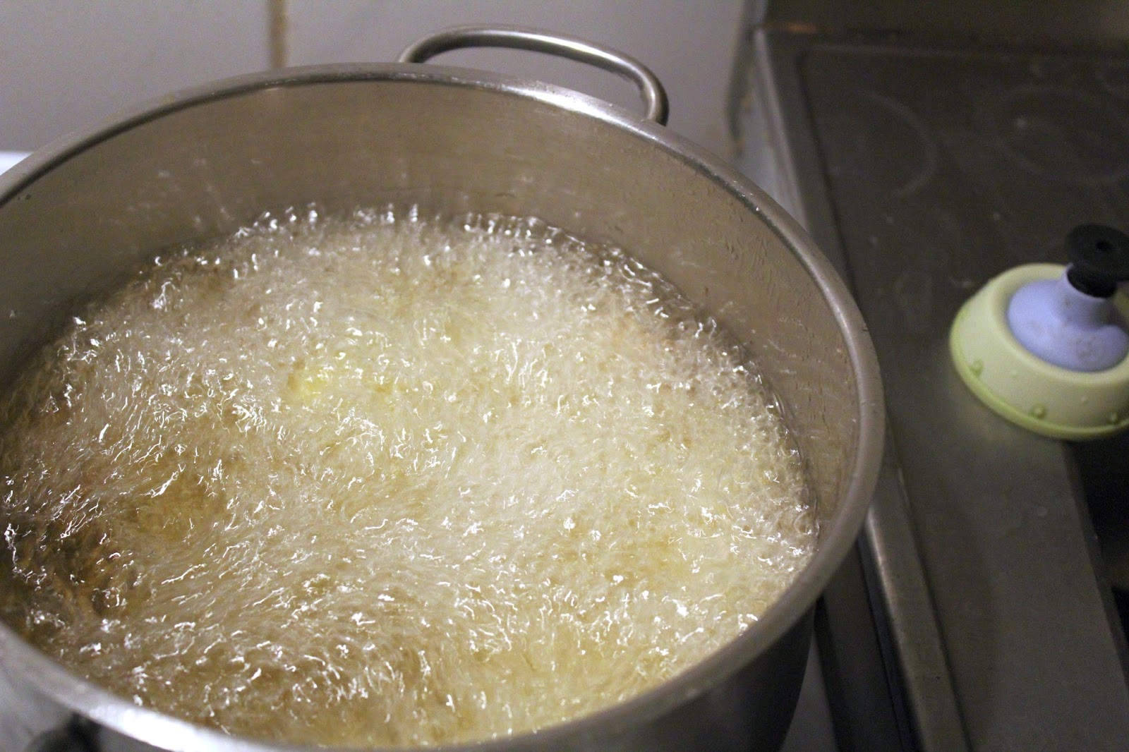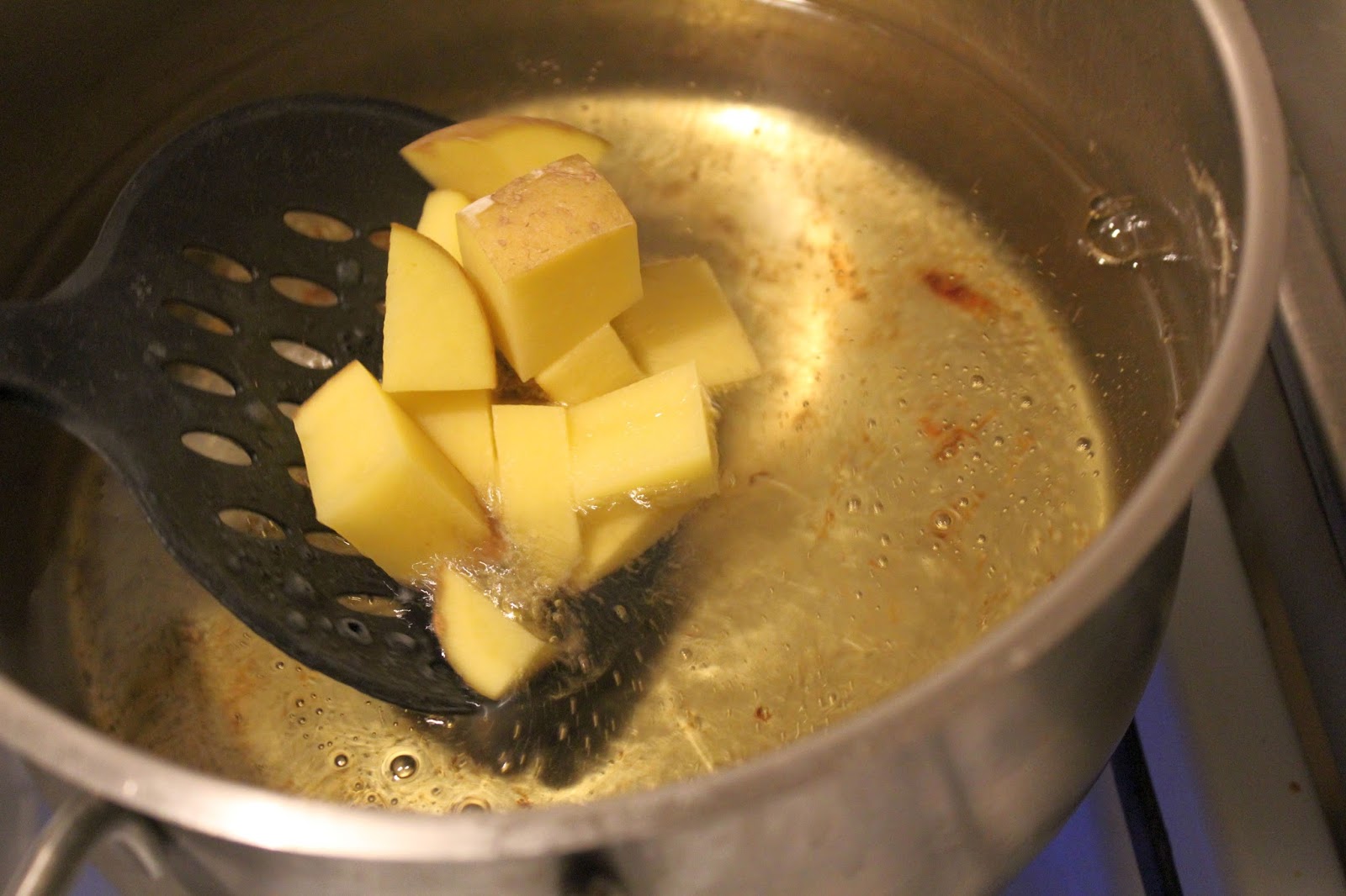 Deckel auf den Topf legen, um übermäßige Geruchsentwicklung zu vermeiden. Wie lange die Kartoffelwürfel im Fett verbleiben müssen hängt von der Temperatur des Fettes ab. Ich habe die Kartoffelwürfel 5 Minuten im Topf gelassen, dann ist die Farbe angenehm braun.