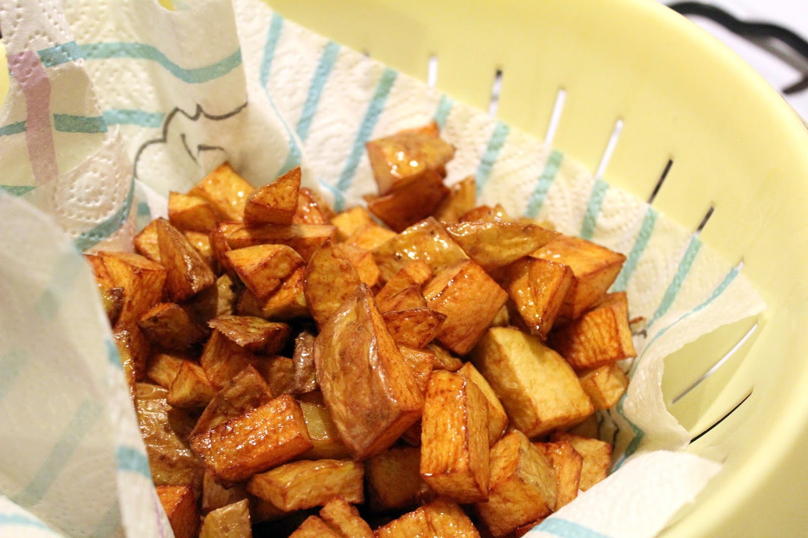 Die Kartoffeln hebe ich mit dem Schaumlöffel aus dem Topf und lege sie zum Entfetten in ein mit Küchenkrepp ausgelegtes Nudelsieb.