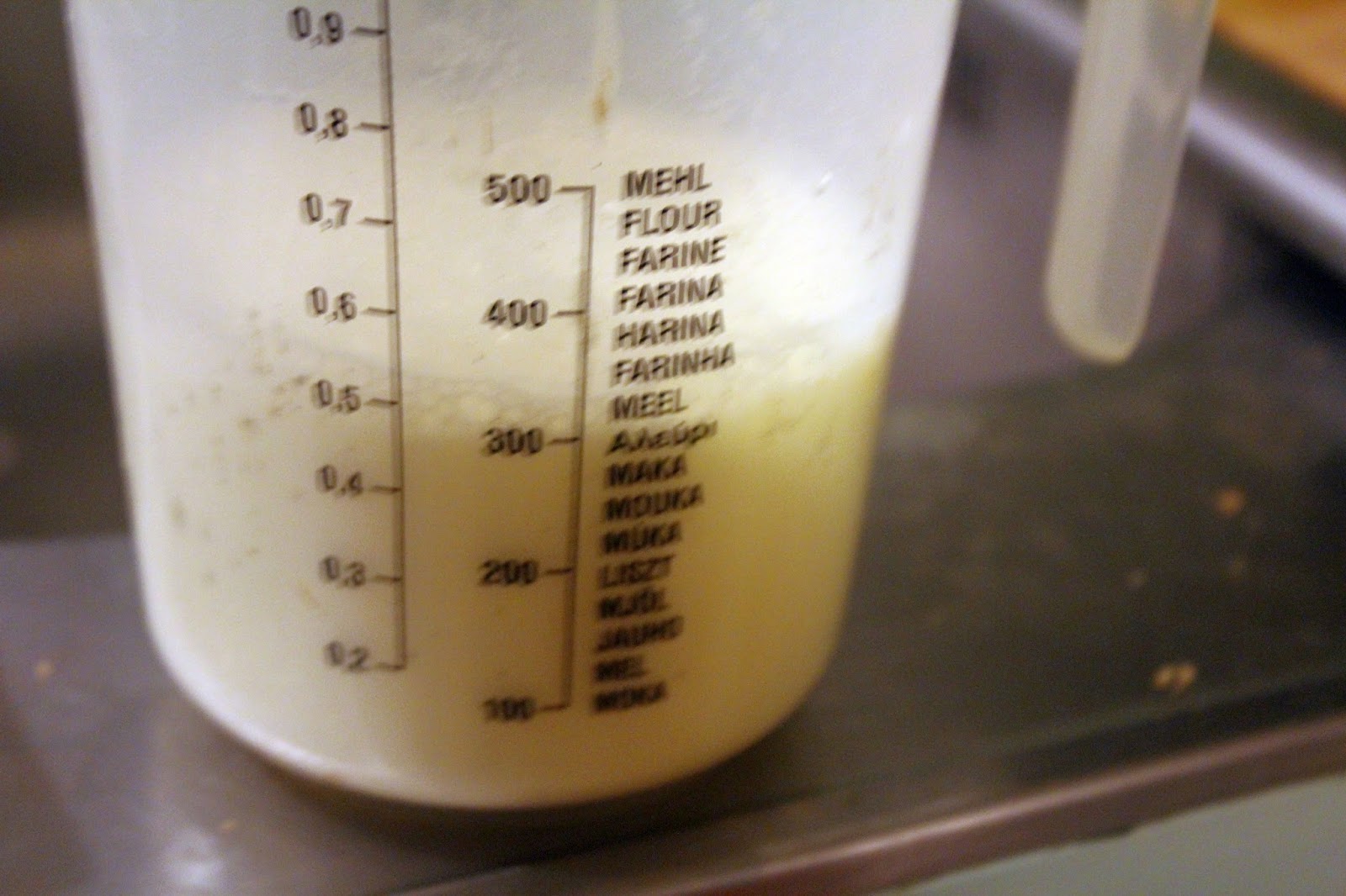 500 Milliliter Milch abmessen und in eine Rührschüssel kippen.