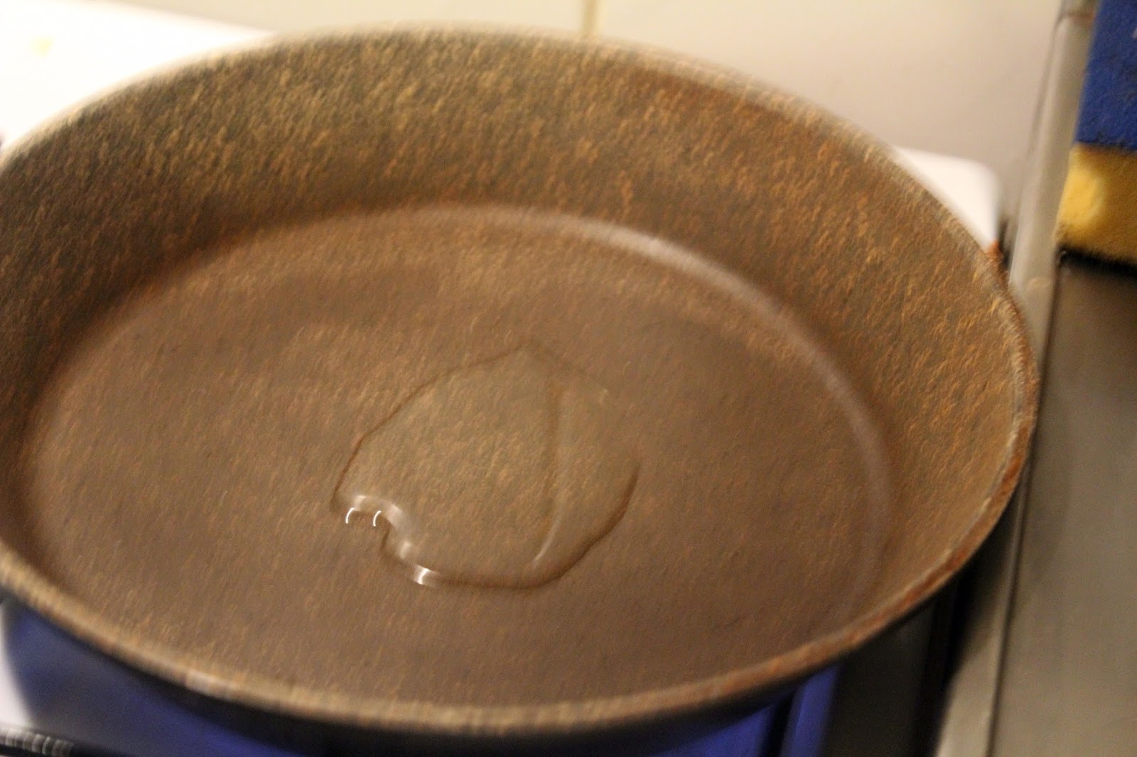 Pfanne erhitzen. Ich habe Pflanzenöl verwendet, aber es geht auch Butter, oder Schmalz.