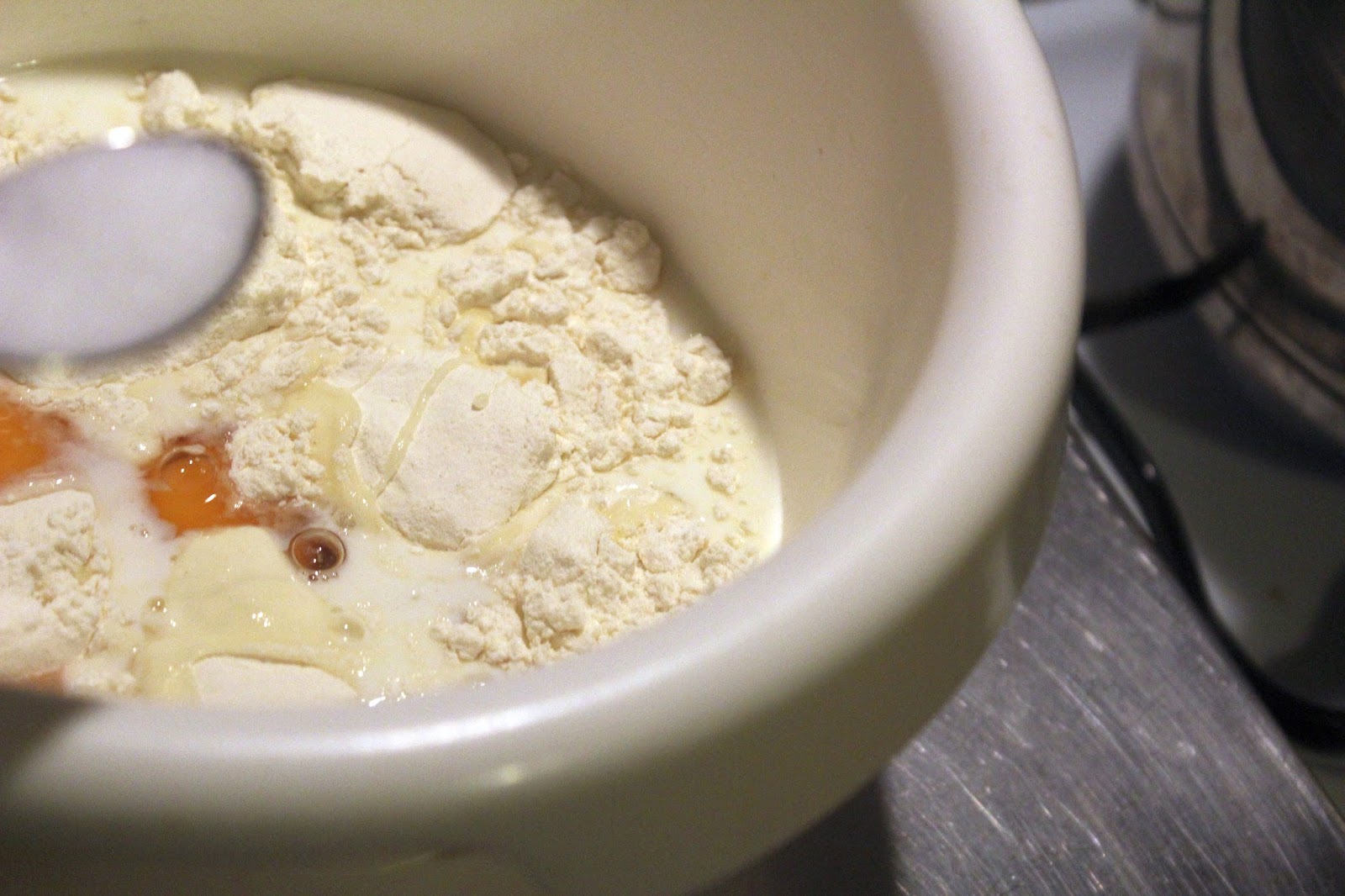 Man kann den Pfannkuchenteig ein wenig ruhen lassen, dann verbindet er sich noch besser.