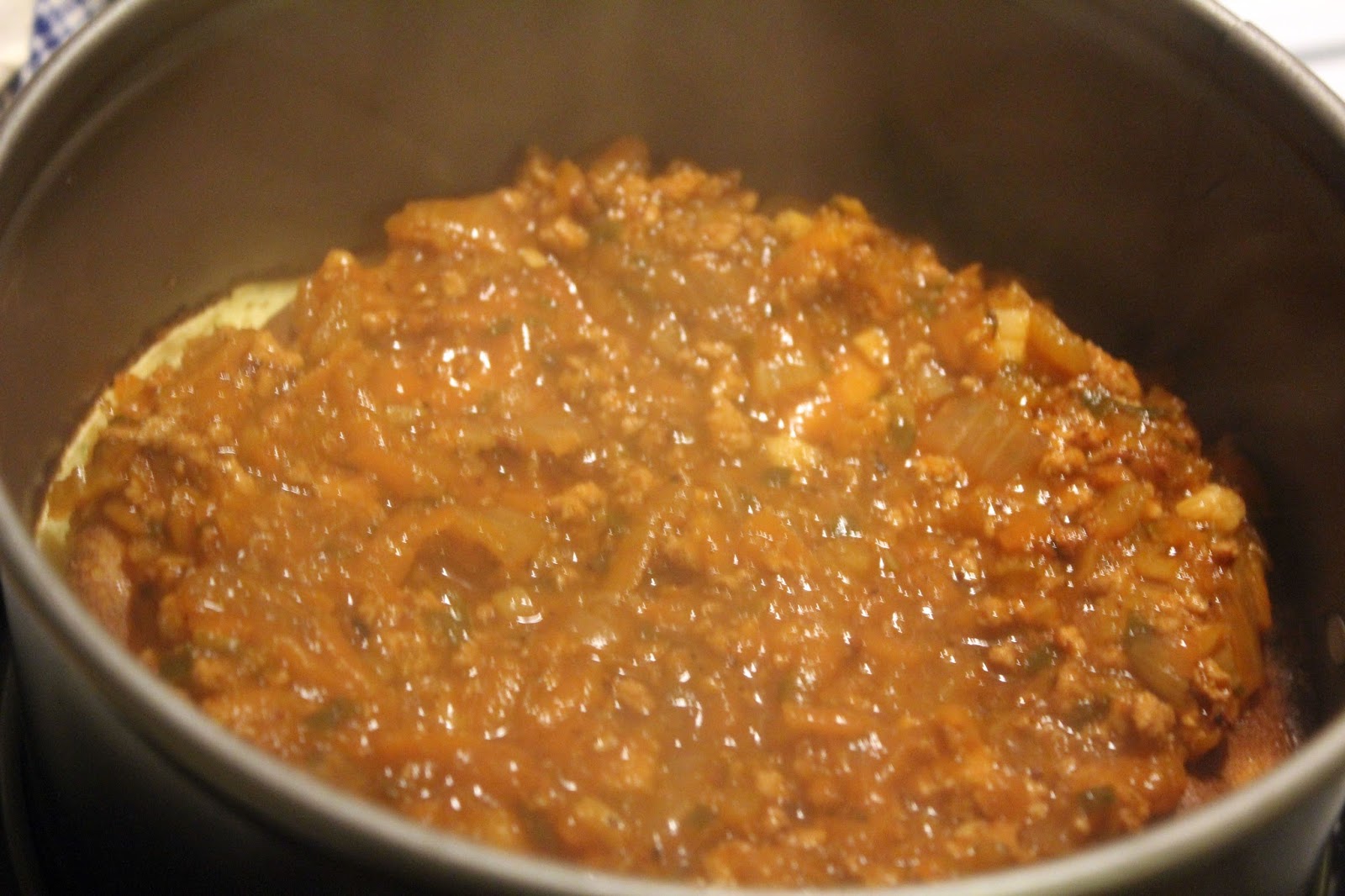 Darauf kommt wieder eine Lage Pfannkuchen, die dann ebenfalls wieder mit Bolognese bestrichen wird.