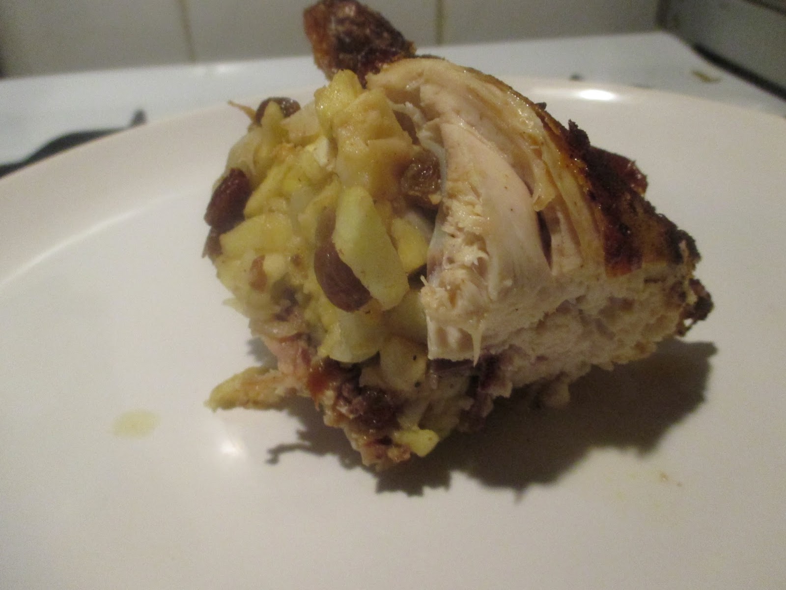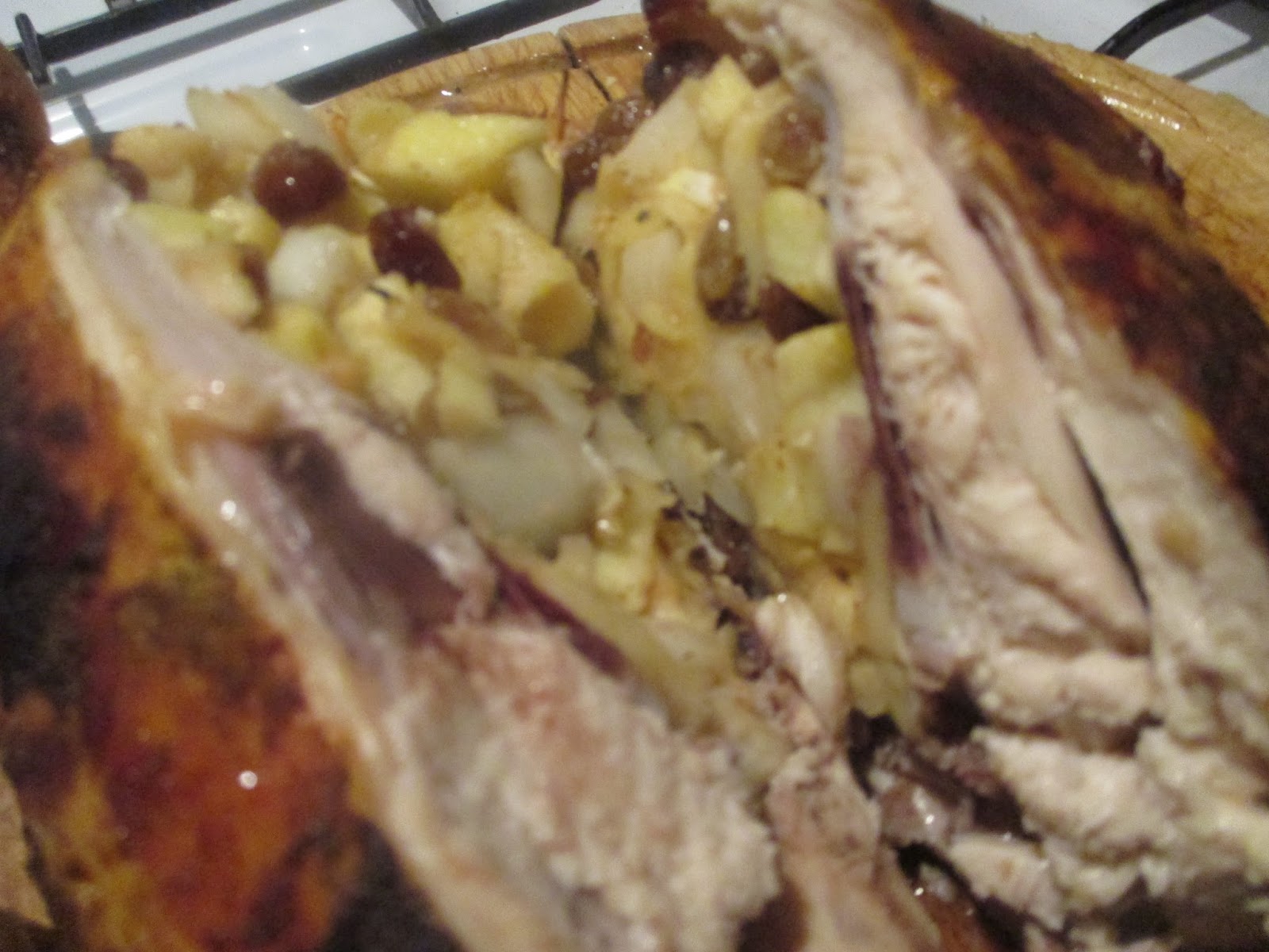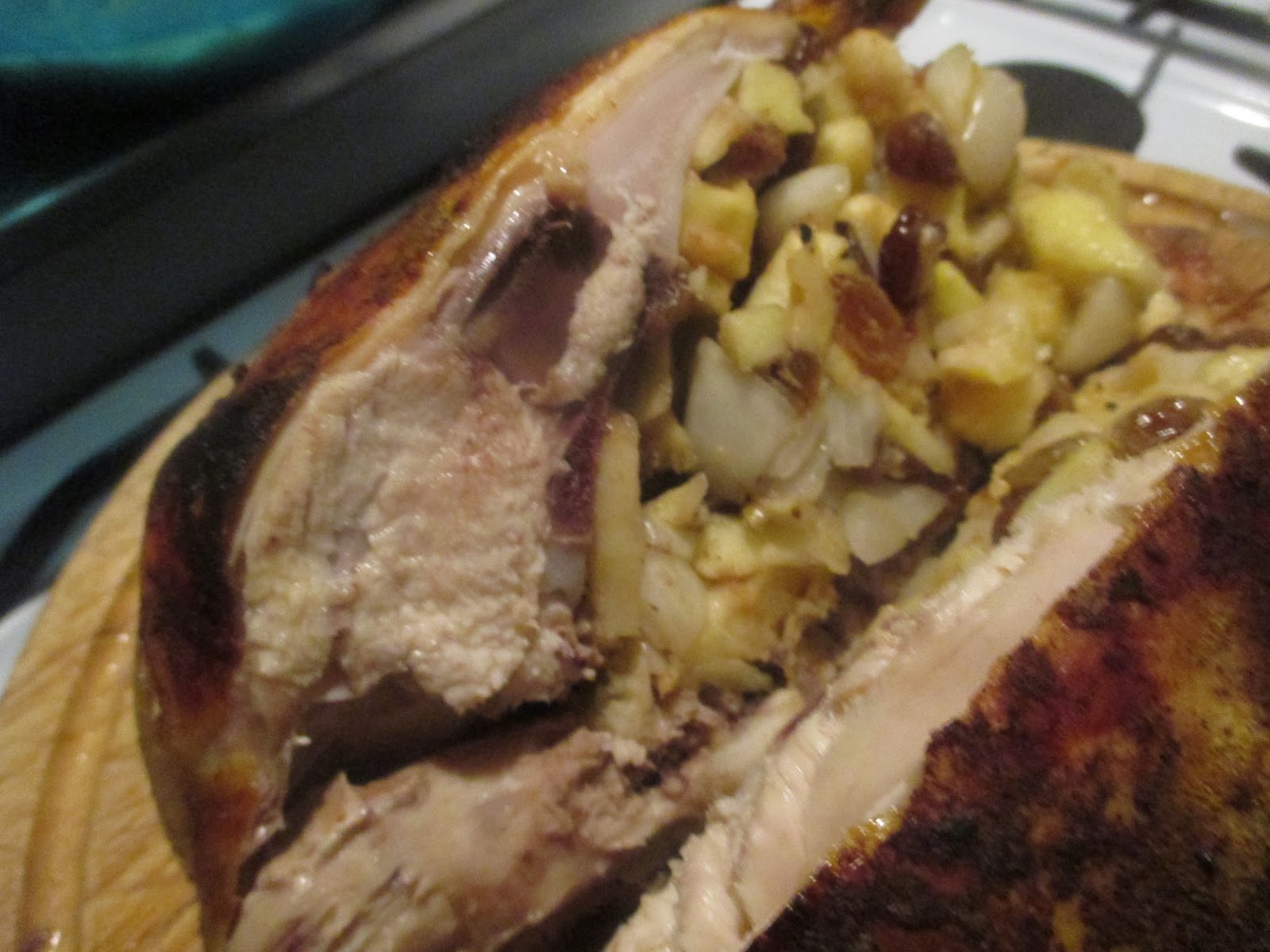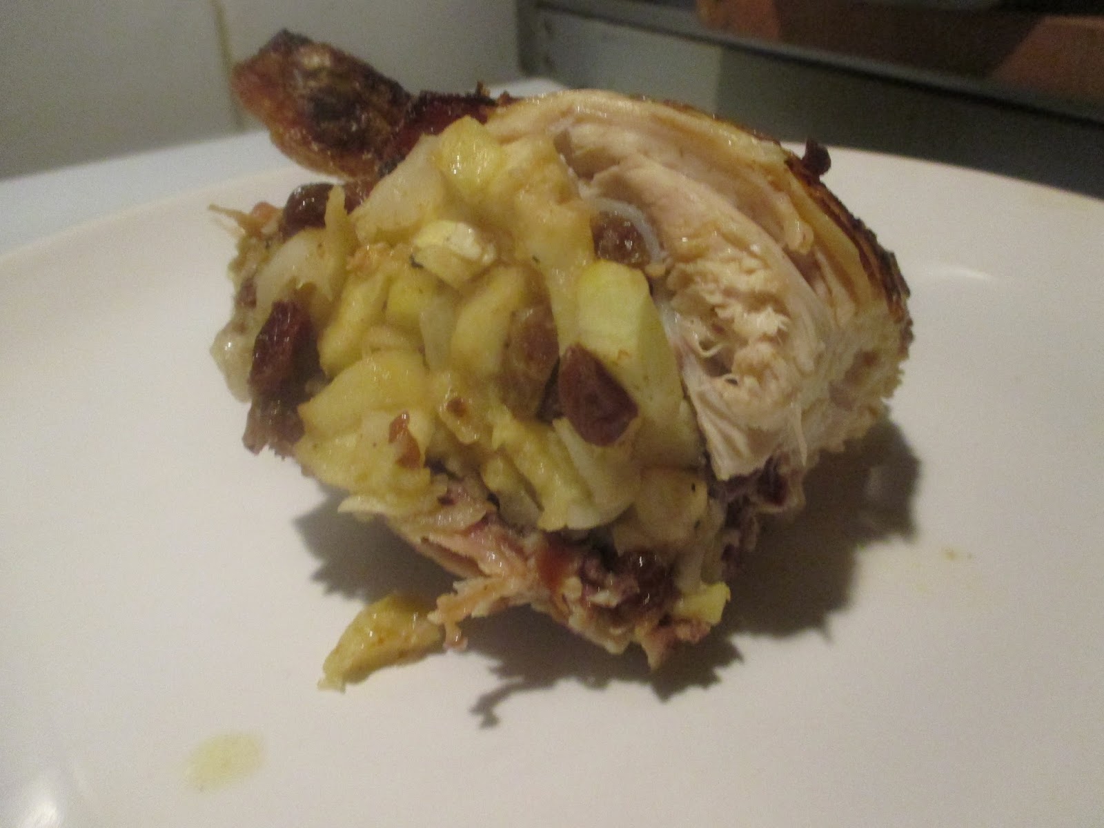 Ich wollte nur mal erwähnen, dass in einer Woche Frühlingsanfang ist. Das Wetter fühlt sich aber eher an wie Winteranfang. Deswegen habe ich einen liegengebliebenen Beitrag, den ich nur fotografiert, aber noch nicht getextet hatte ausgegraben und werfe den noch mal auf den Markt, bevor sich das Frühjahr wirklich einstellt. Hähnchen mit einer weihnachtlichen Füllung aus Äpfeln, Zwiebeln und Rosinen. Das ist saulecker, aber irgendwie war immer etwas anderes wichtiger und musste eher gezeigt werden. Damit hätte ich vor Weihnachten auch allen Schotten und Schwaben eine Freude machen können, weil es weniger kostet als eine Weihnachtsgans. Wenn sich das Wetter nicht mehr ändert, wäre es somit auch mit Augenzwinkern ein schönes Osteressen. Besser als dann einen Hasen zu essen, denn der muss ja noch die Eier bringen.