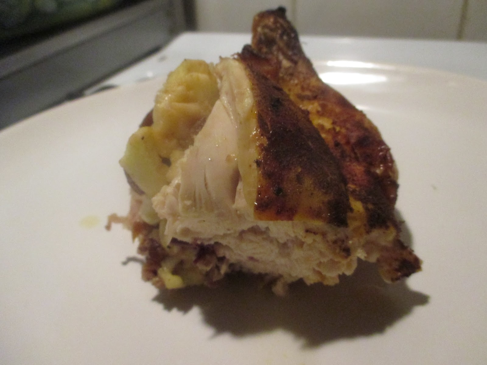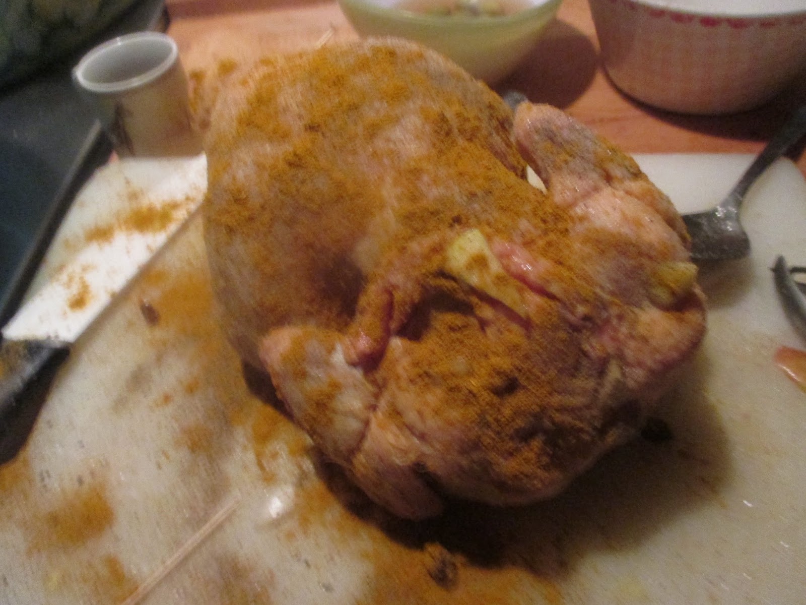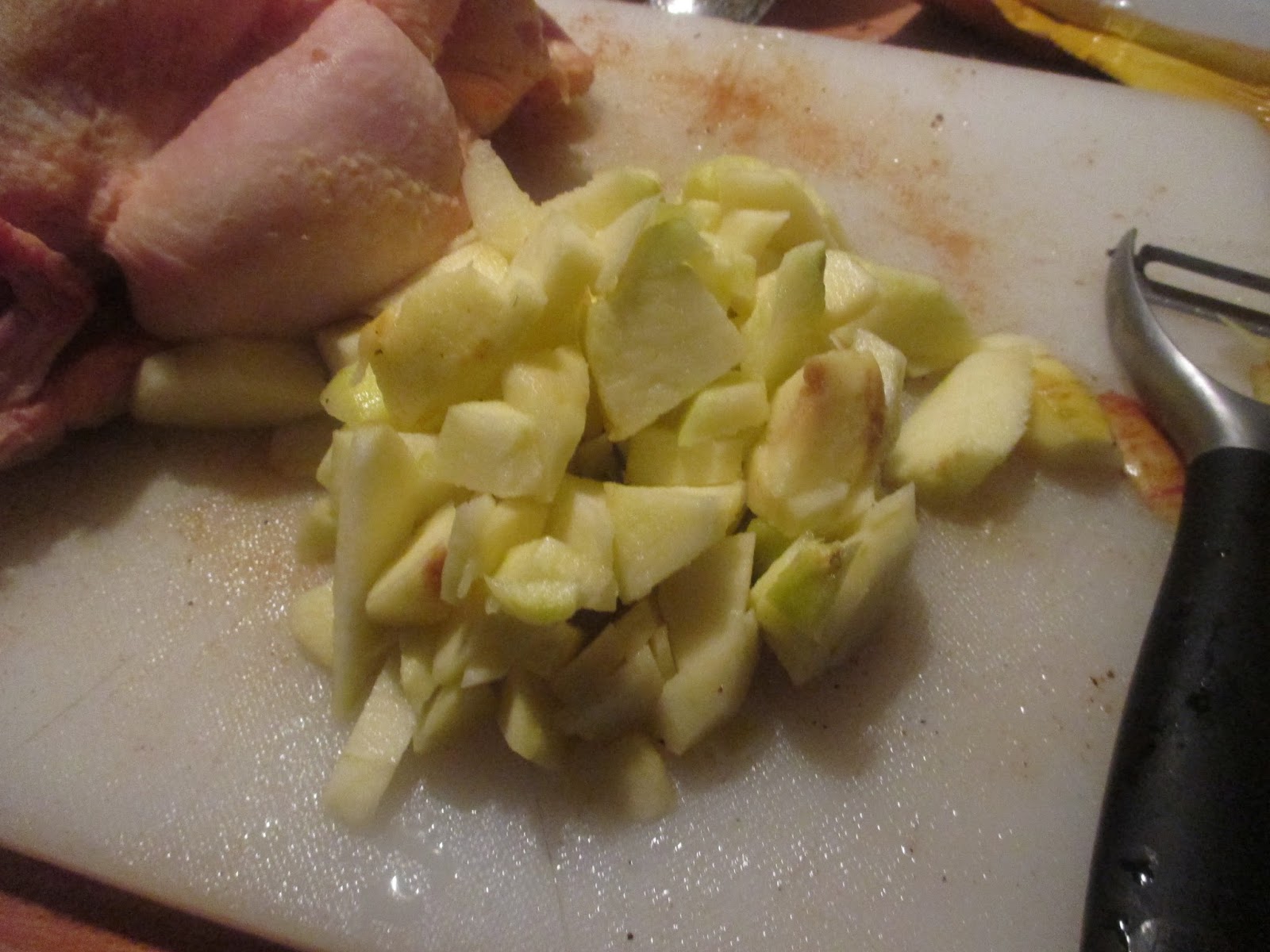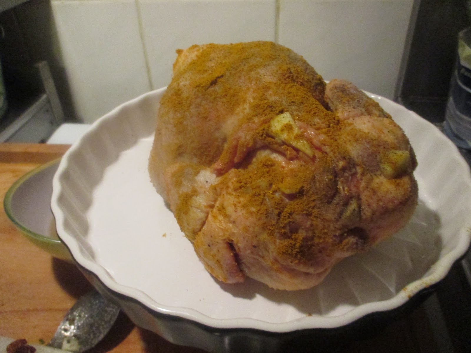 Ich wollte nur mal erwähnen, dass in einer Woche Frühlingsanfang ist. Das Wetter fühlt sich aber eher an wie Winteranfang. Deswegen habe ich einen liegengebliebenen Beitrag, den ich nur fotografiert, aber noch nicht getextet hatte ausgegraben und werfe den noch mal auf den Markt, bevor sich das Frühjahr wirklich einstellt. Hähnchen mit einer weihnachtlichen Füllung aus Äpfeln, Zwiebeln und Rosinen. Das ist saulecker, aber irgendwie war immer etwas anderes wichtiger und musste eher gezeigt werden. Damit hätte ich vor Weihnachten auch allen Schotten und Schwaben eine Freude machen können, weil es weniger kostet als eine Weihnachtsgans. Wenn sich das Wetter nicht mehr ändert, wäre es somit auch mit Augenzwinkern ein schönes Osteressen. Besser als dann einen Hasen zu essen, denn der muss ja noch die Eier bringen.