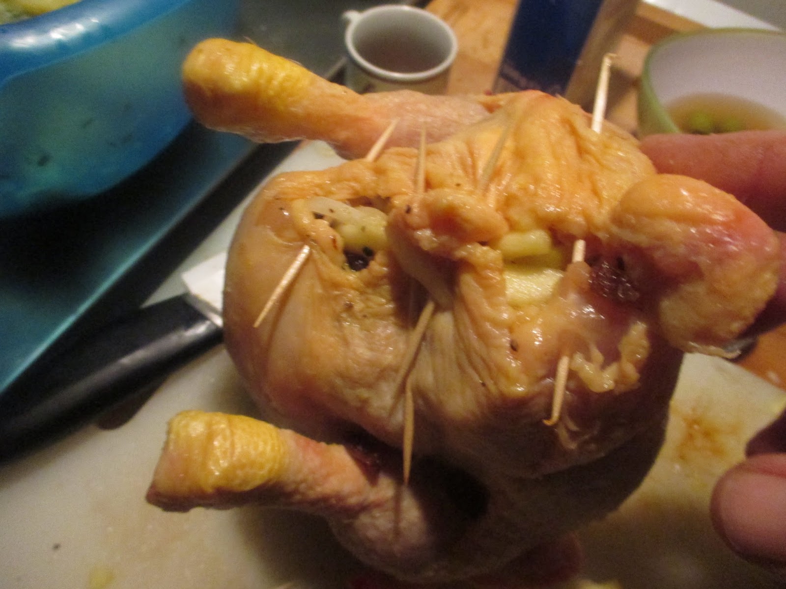 Damit die Füllung im Ofen nicht wieder rausfällt, wird das Huhn mit Zahnstochern verschlossen.