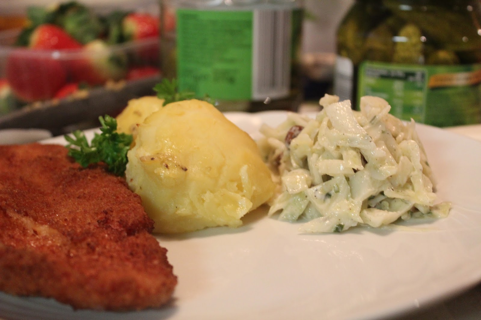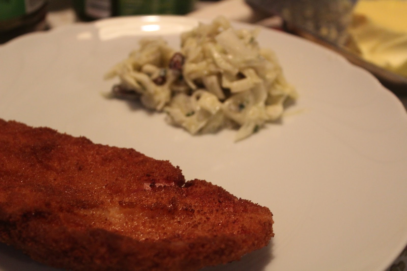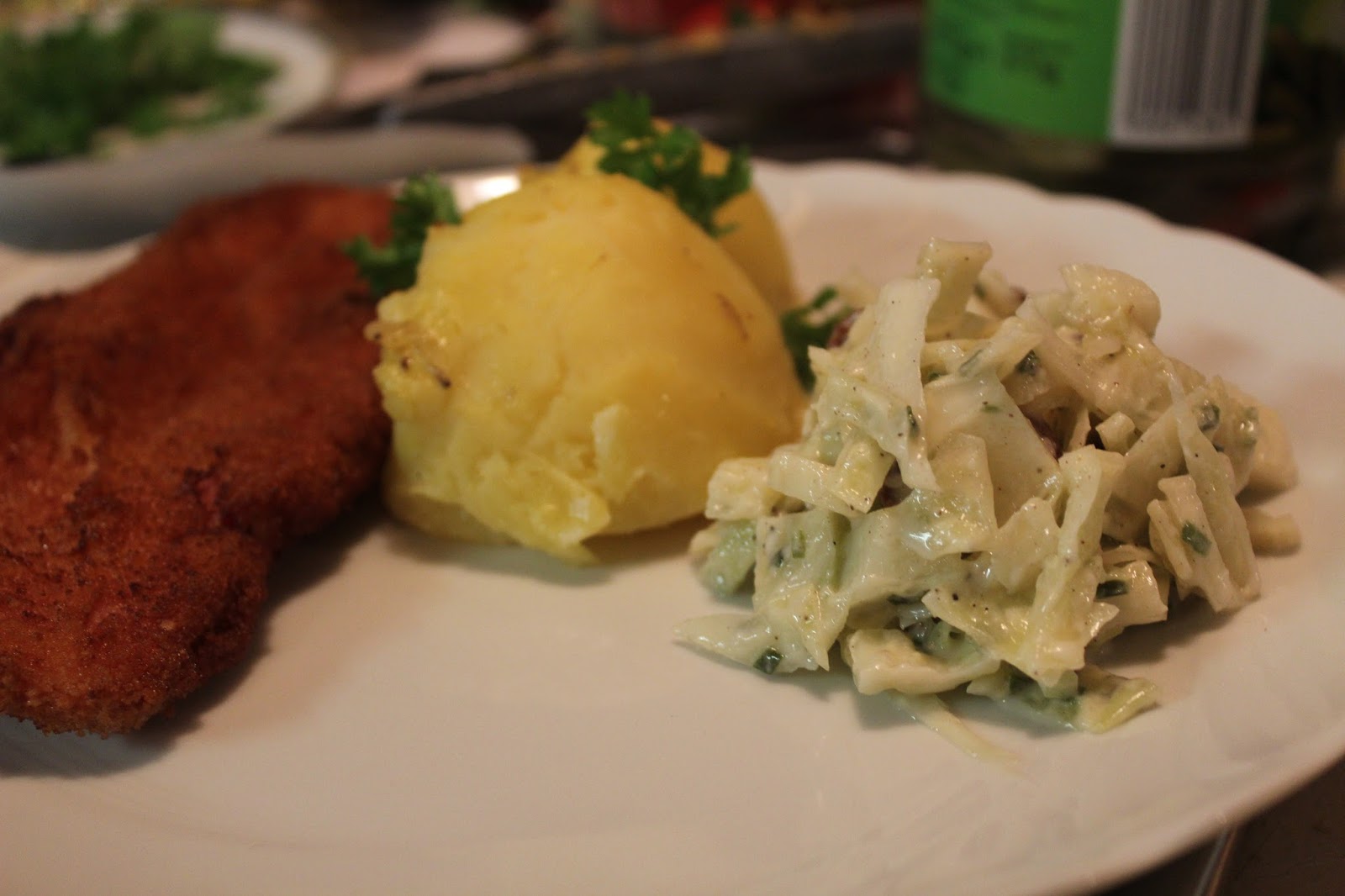 Der Krautsalat ist auch denkbar einfach. Weißkraut schneiden, oder hobeln, Salz, Pfeffer und Zucker zum Würzen, Den Saft einer Zitrone zum Marinieren einen Topf Sahne und eine Handvoll Rosinen dazu geben und noch Schnittlauch für die Frische. Den Salat kann man auch gut vorbereiten und der ist echt lecker.