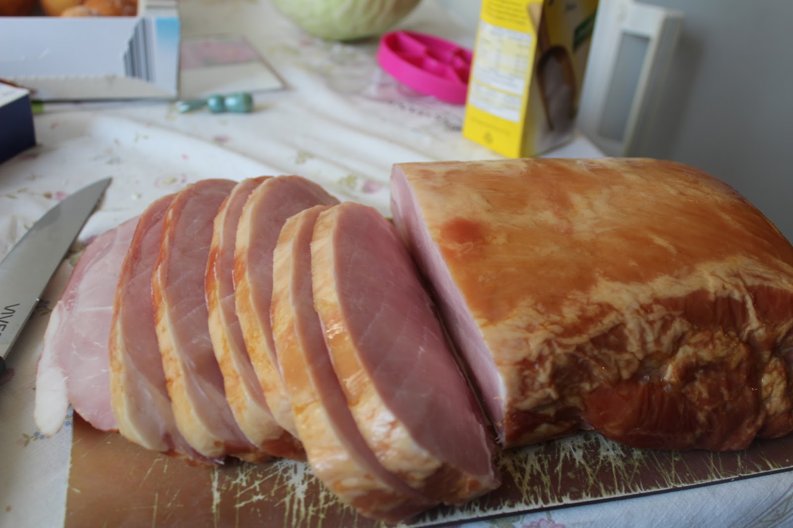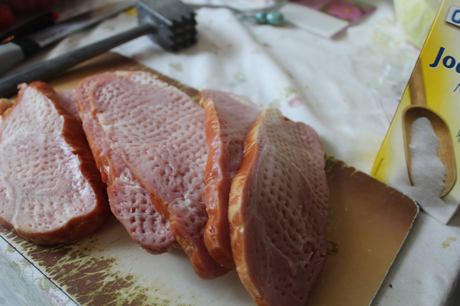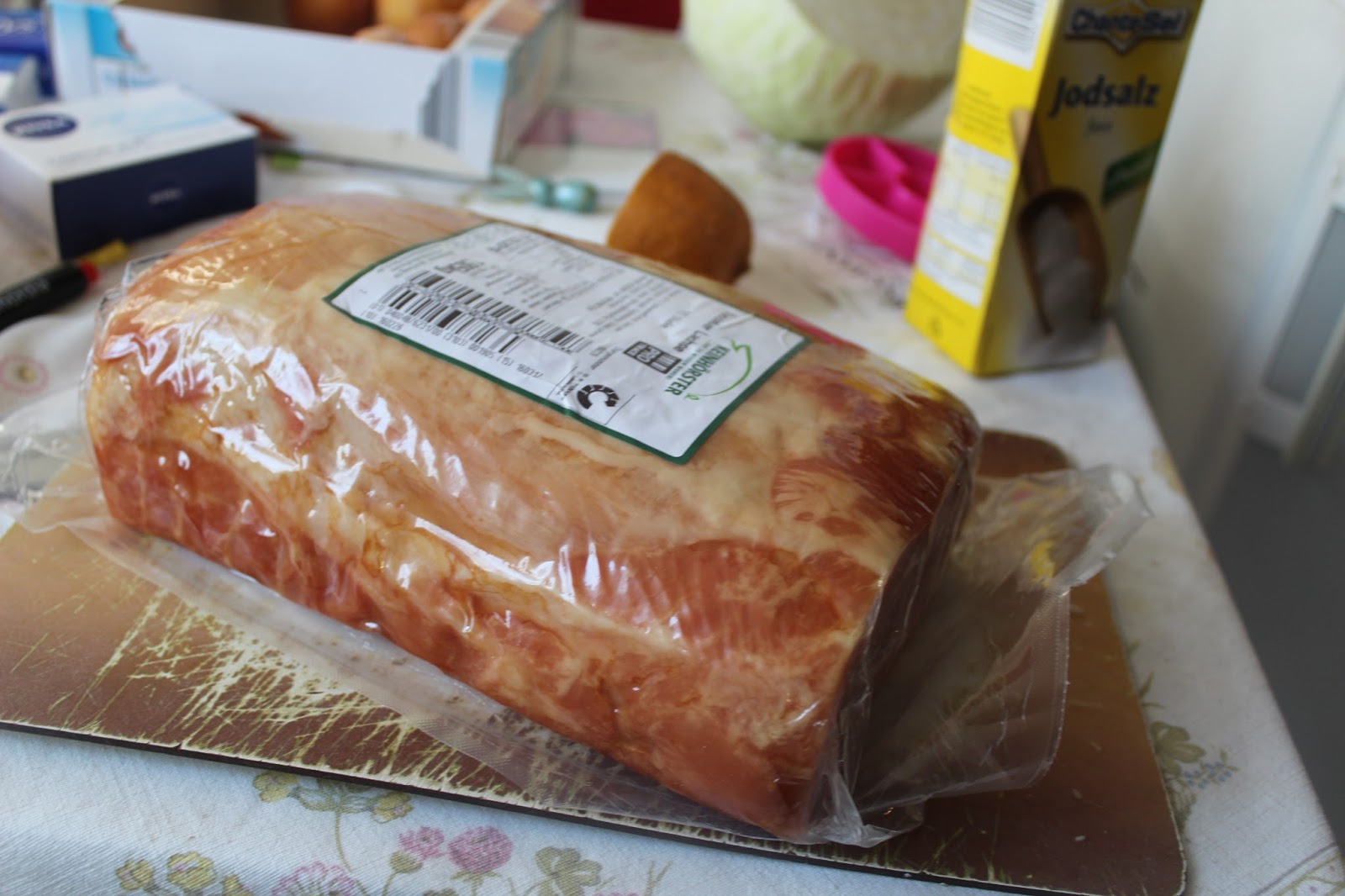 Kasslerlachs, nein das hat nichts mit Lachs zu tun, sondern ist ein Stück vom Schweinerücken, in Scheiben schneiden.