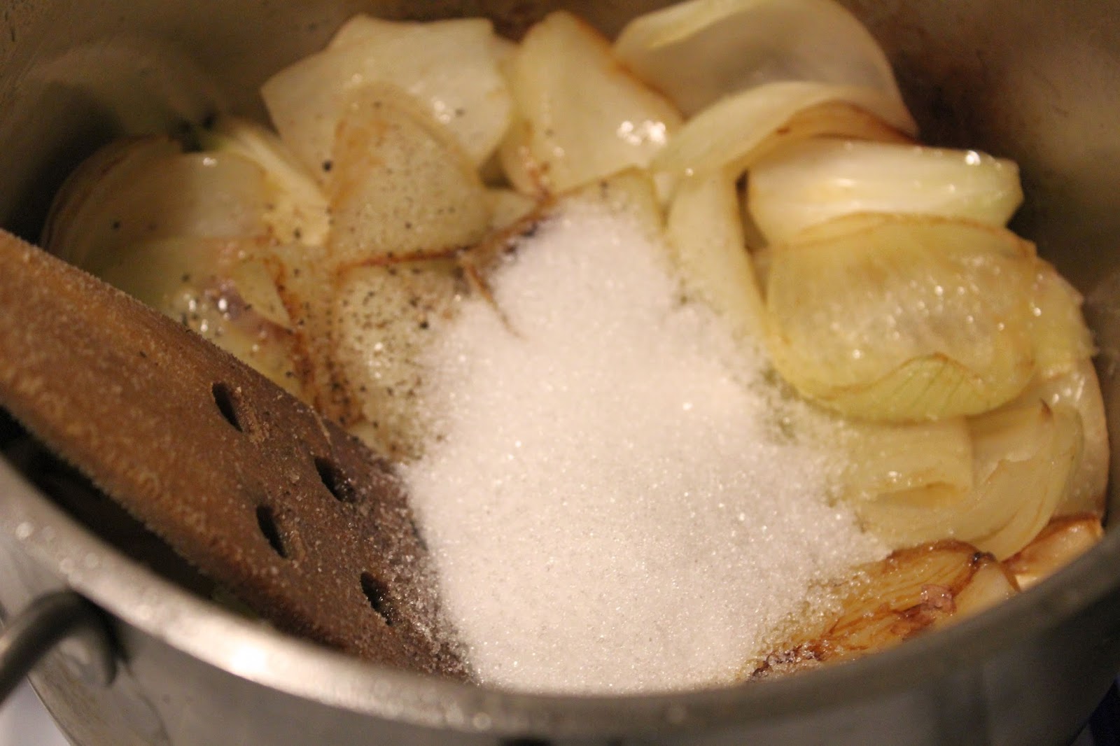 Wenn Zwiebeln und Knoblauch schon Farbe bekommen haben, mit ordentlich Zucker, mäßig Salz und reichlich Pfeffer würzen.