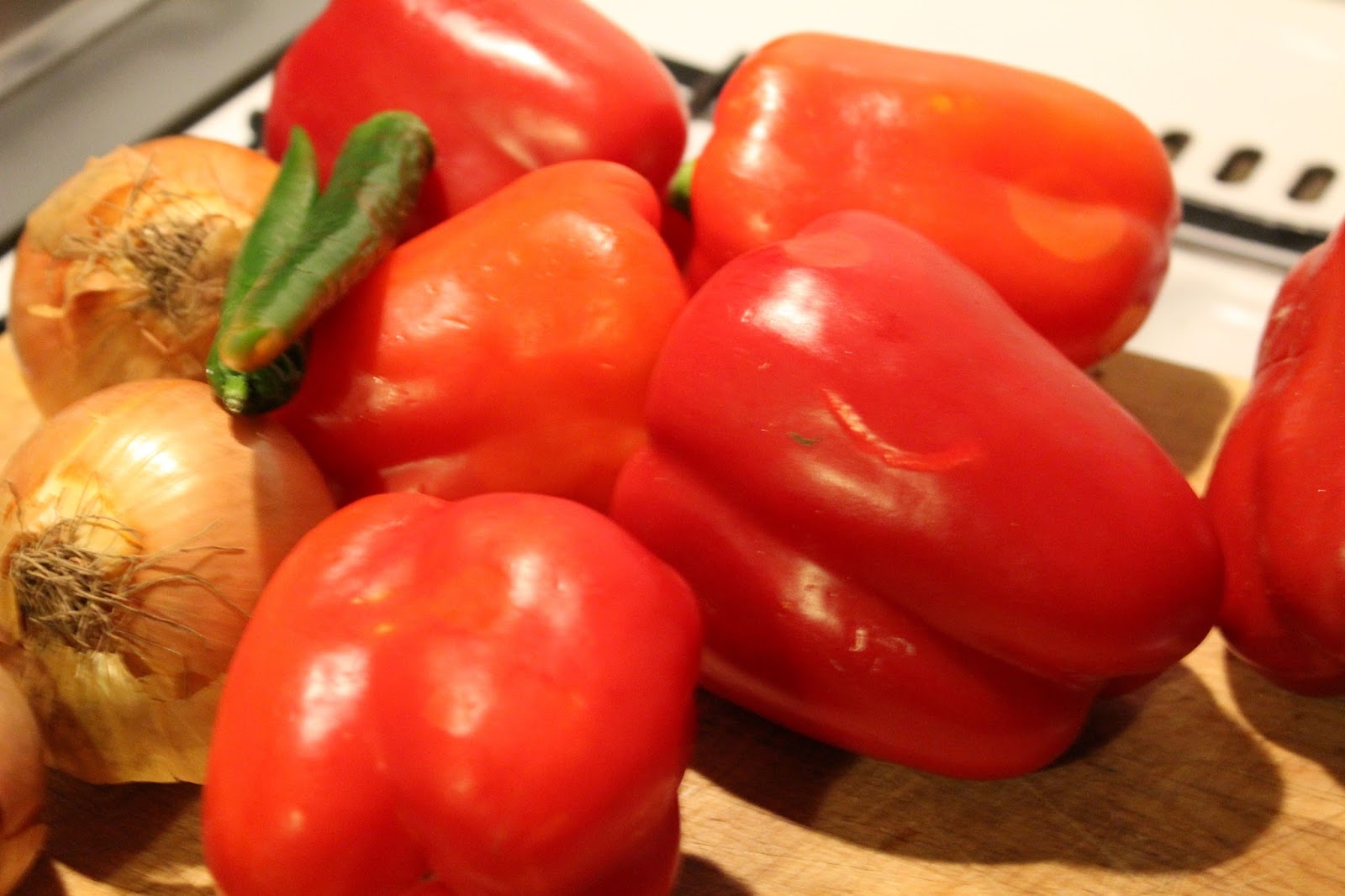 In der Zwischenzeit die Paprikaschoten aufschneiden und entkernen. Die müssen nicht wirklich klein geschnitten werden, vielleicht in Viertel.