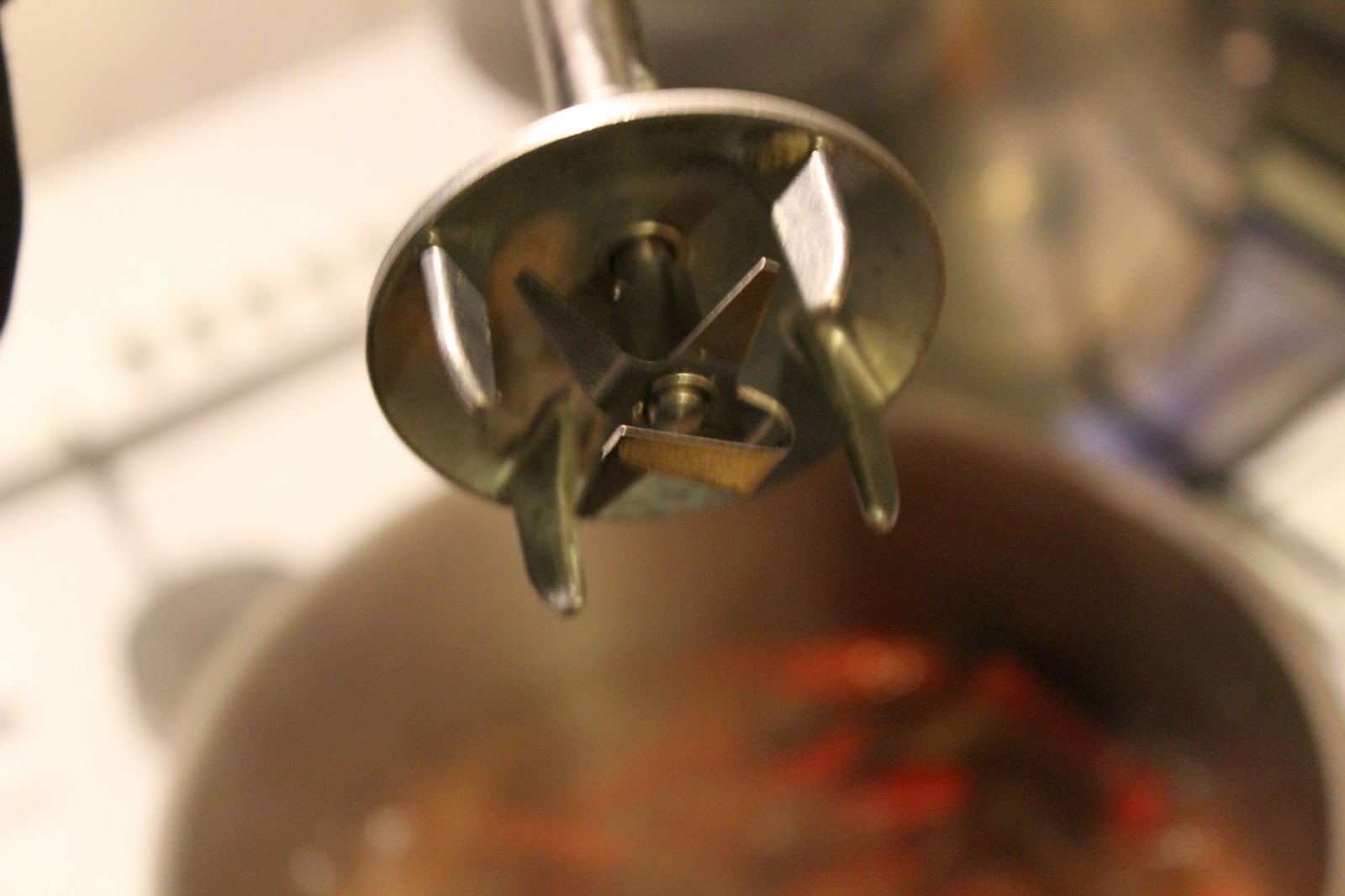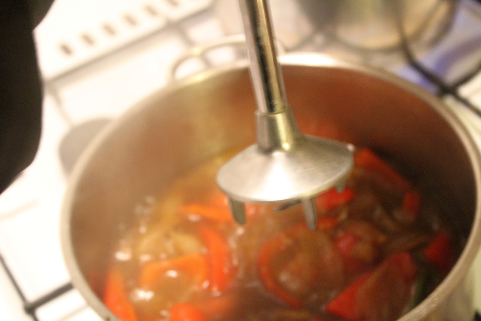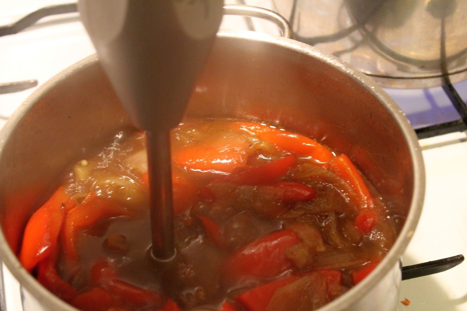 Ich benutze dafür meinen Esge Zauberstab. Wer den noch nicht kennt, hier mal zur Ansicht. Mit dem Messer kann man alles kurz und klein machen und dabei bekommt alles noch eine schaumig-luftige Konsistenz. Bei 19000 Umdrehungen auf meiner 250 Watt Angeberversion haben die Paprika keine Chance. Das Ding ist wie ein italienisches Auto, viel Drehzahl, wenig Drehmoment, aber geil!