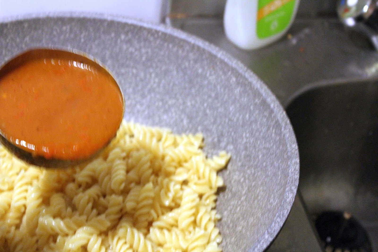 Mit der Schöpfkelle kommt die Paprikasoße zu den Nudeln