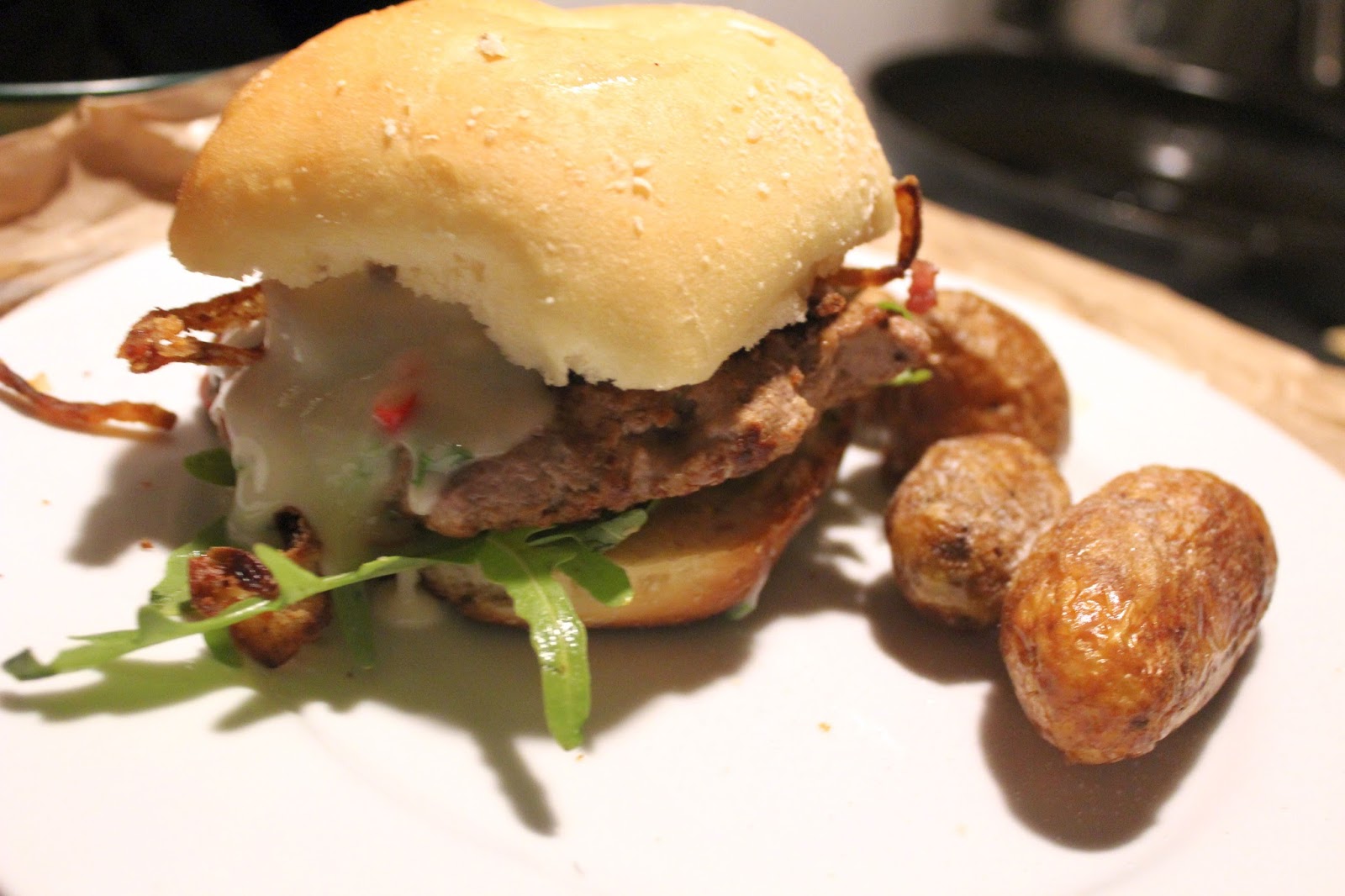 Das ist wirklich großes Geschmackskino und Junkfood ohne Junk, aus der Abteilung slowfood. Selbst gemachter Apfelsenf, selbst gemachtes Ketchup mit Apfelmus, selbst gemachter Kochkäse, selbst gebackene Burger Buns mit Bergkäse, selbst gemachte Röstzwiebeln und selbst gewolftes Schweinefilet, an bei und in Symbiose mit frischem Rucola und Tomaten. Was für ein Fest!
