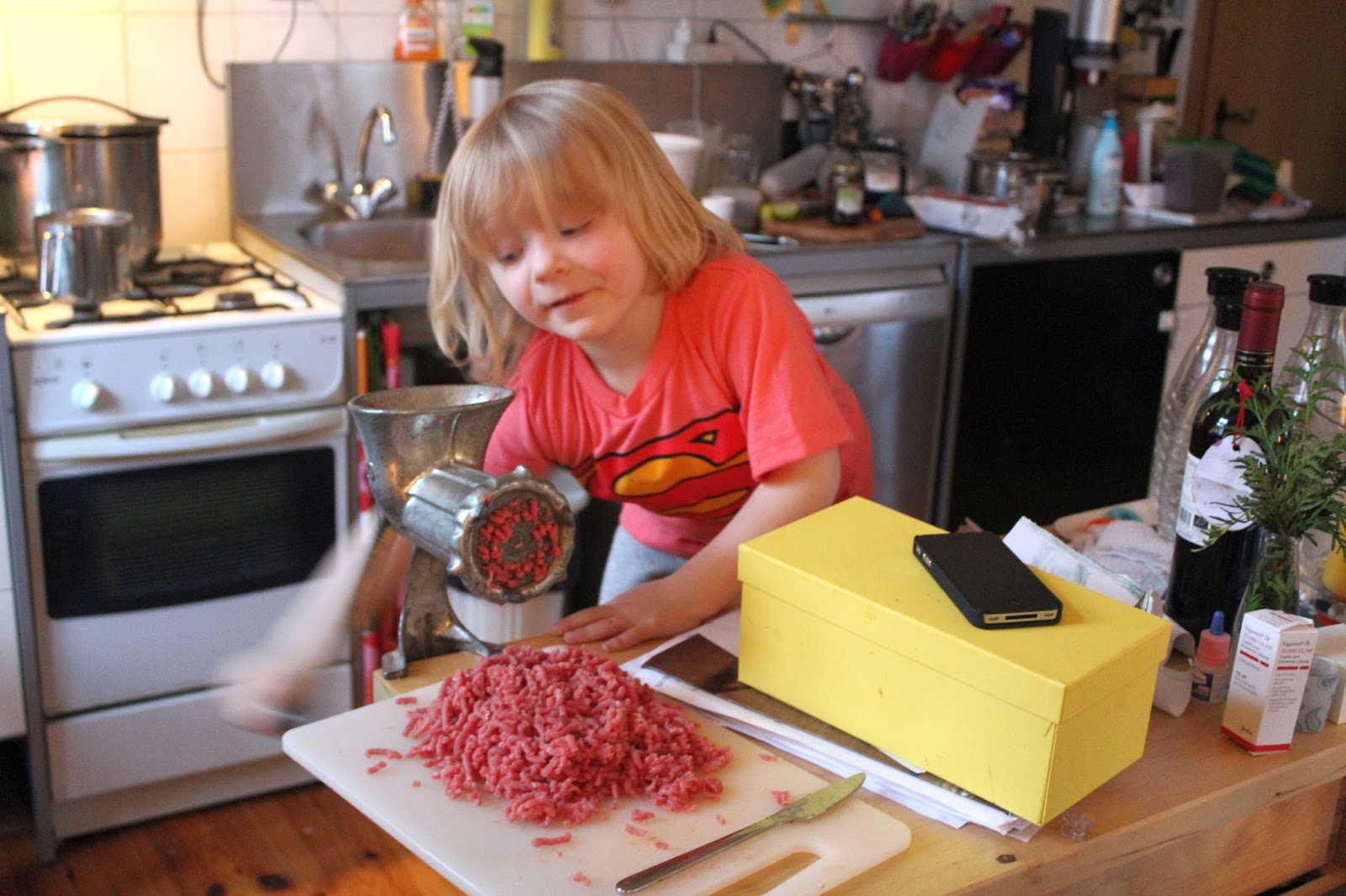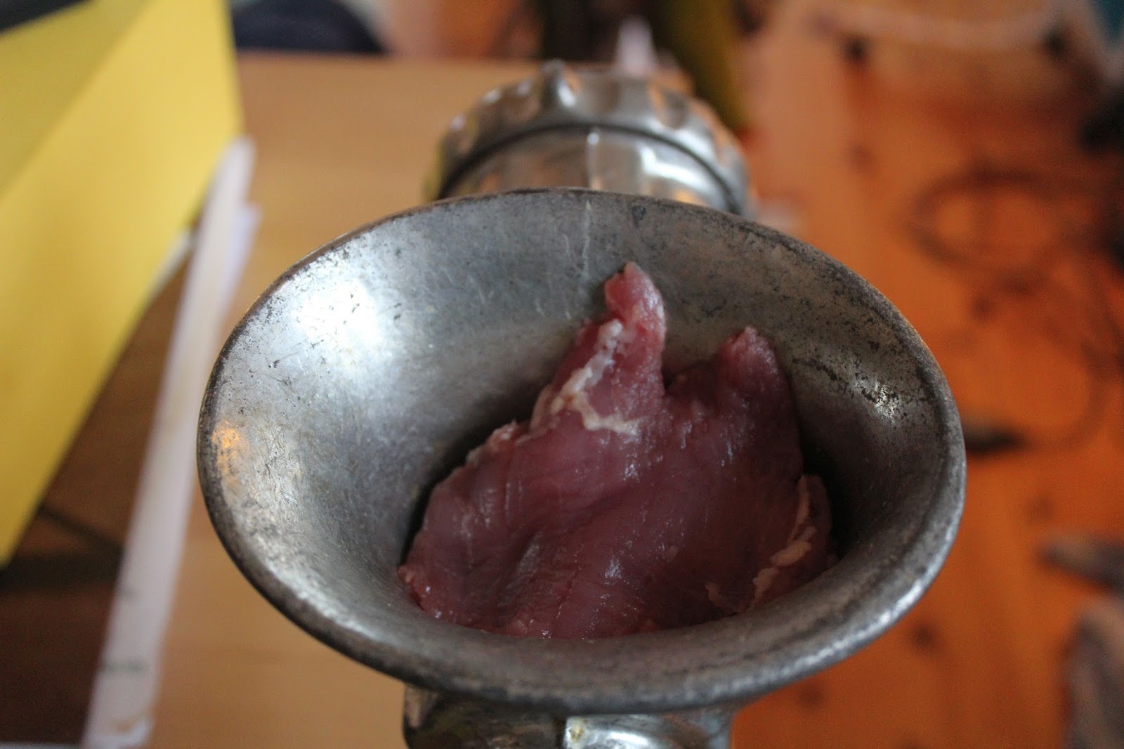 Dann kommt das Fleisch in meinen Fleischwolf. Altes Schrot und Korn vom Alexanderwerk Baujahr 1962. Ich erwähne das jedes Mal, ich weiß, aber den habe ich bei meiner Mutter aus dem Keller entführt und den haben meine Großeltern damals zu Ihrer silbernen Hochzeit bekommen. Als ich letztes Mal in Bremen war, zog meine Mutter irgendeine alte Kladde aus dem Schrank und hat mir sogar noch vorgelesen, wer den Fleischwolf geschenkt hat. Das finde ich echt immer wieder total piefig, Geschenkelisten zu führen, aber das haben meine Altvorderen immer gemacht, damit sie beim nächsten Mal wussten, was sie selbst verschenken müssen, damit es sich preislich im gleichen Rahmen bewegt.