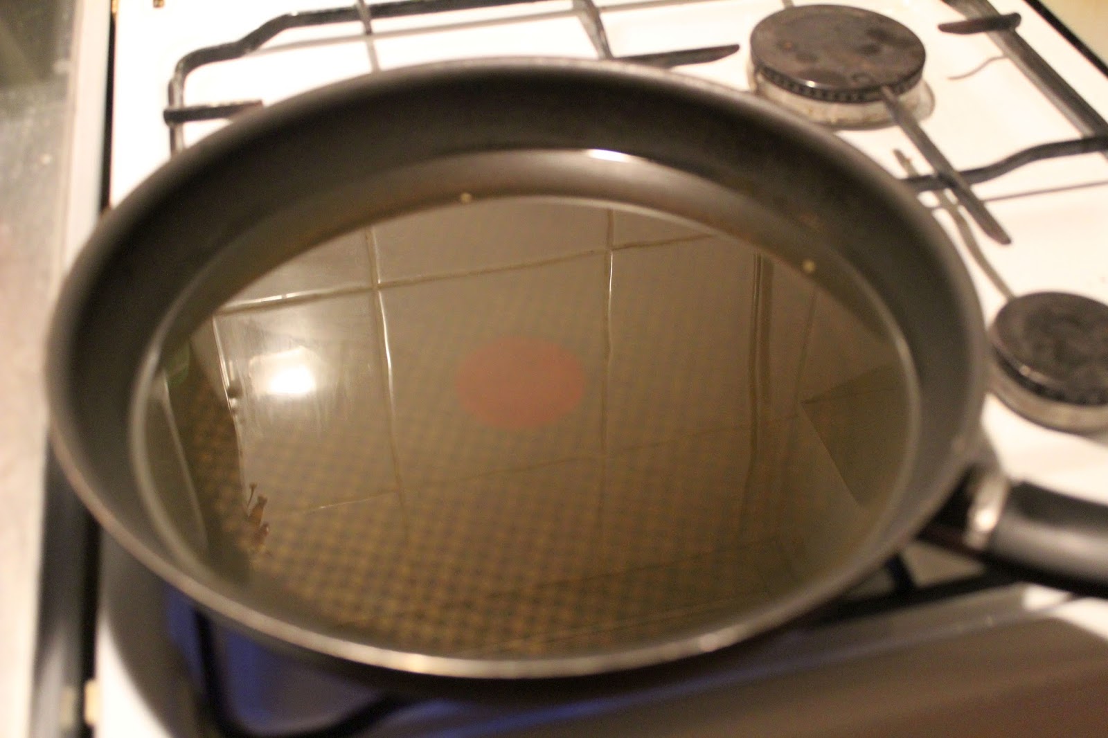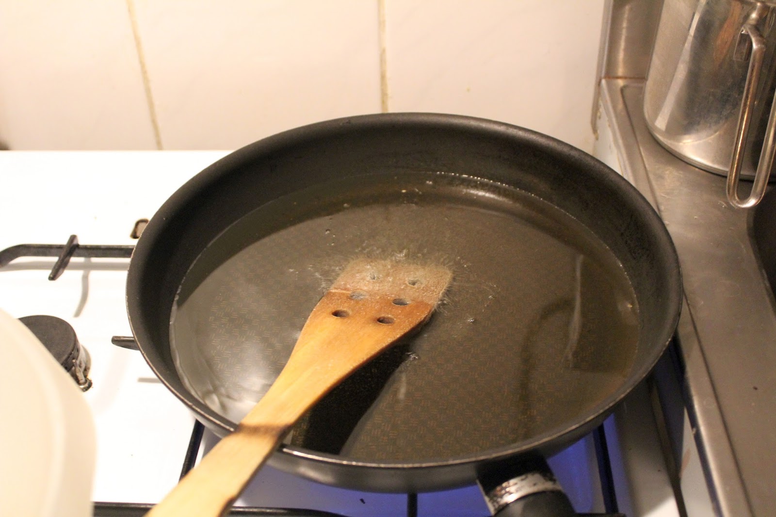 1 Liter Pflanzenöl erhitzen, bis beim Pfannenwender die Blasen aufsteigen.