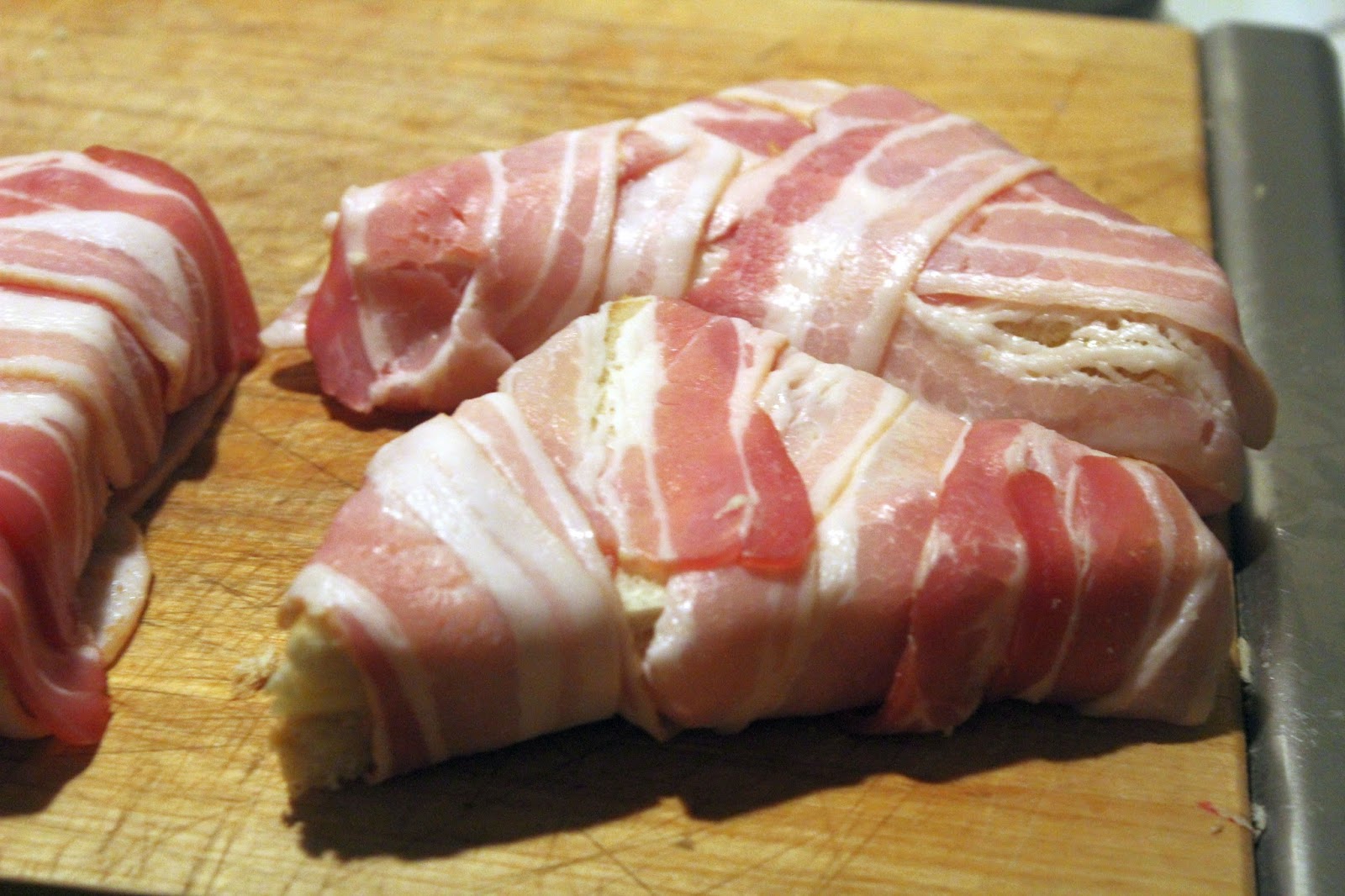 Bacon auf einer Unterlage auslegen, Toast drauflegen und dann den Bacon um das Toast wickeln.