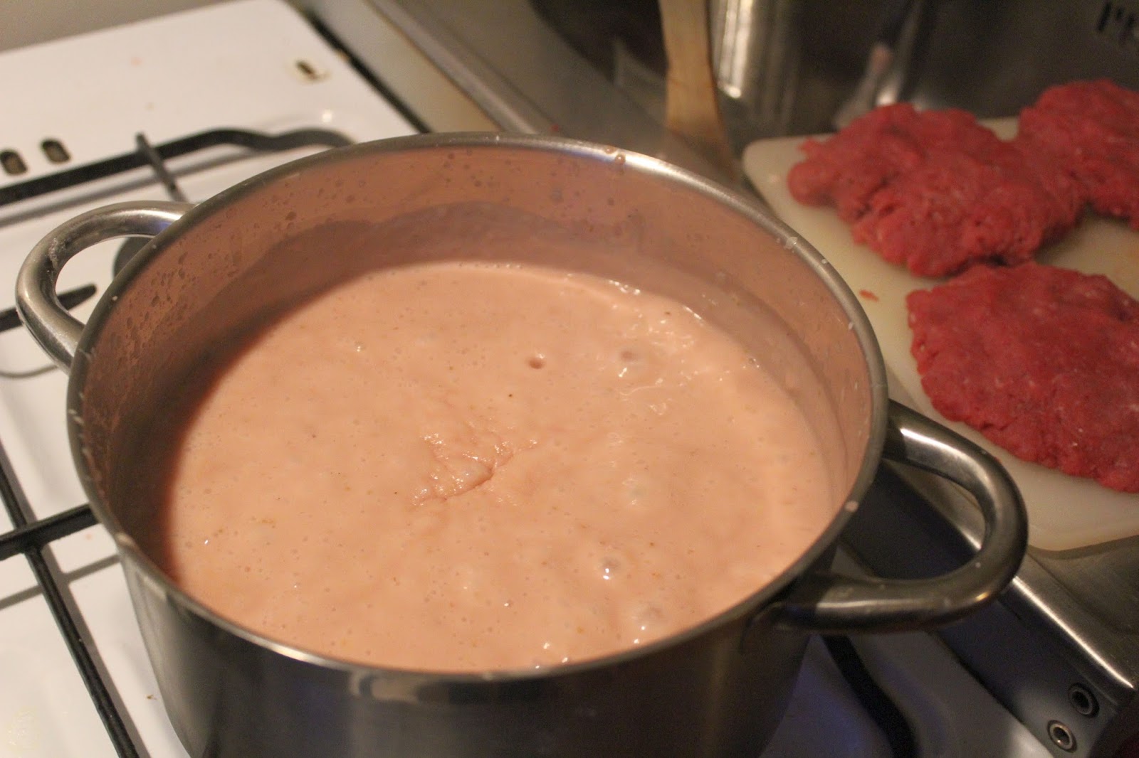 Wenn sie so blubbernde Blasen schlägt, noch einen Minute auf dem Herd lassen und die Flamme runterdrehen. Permanentes Umrühren ist wichtig.