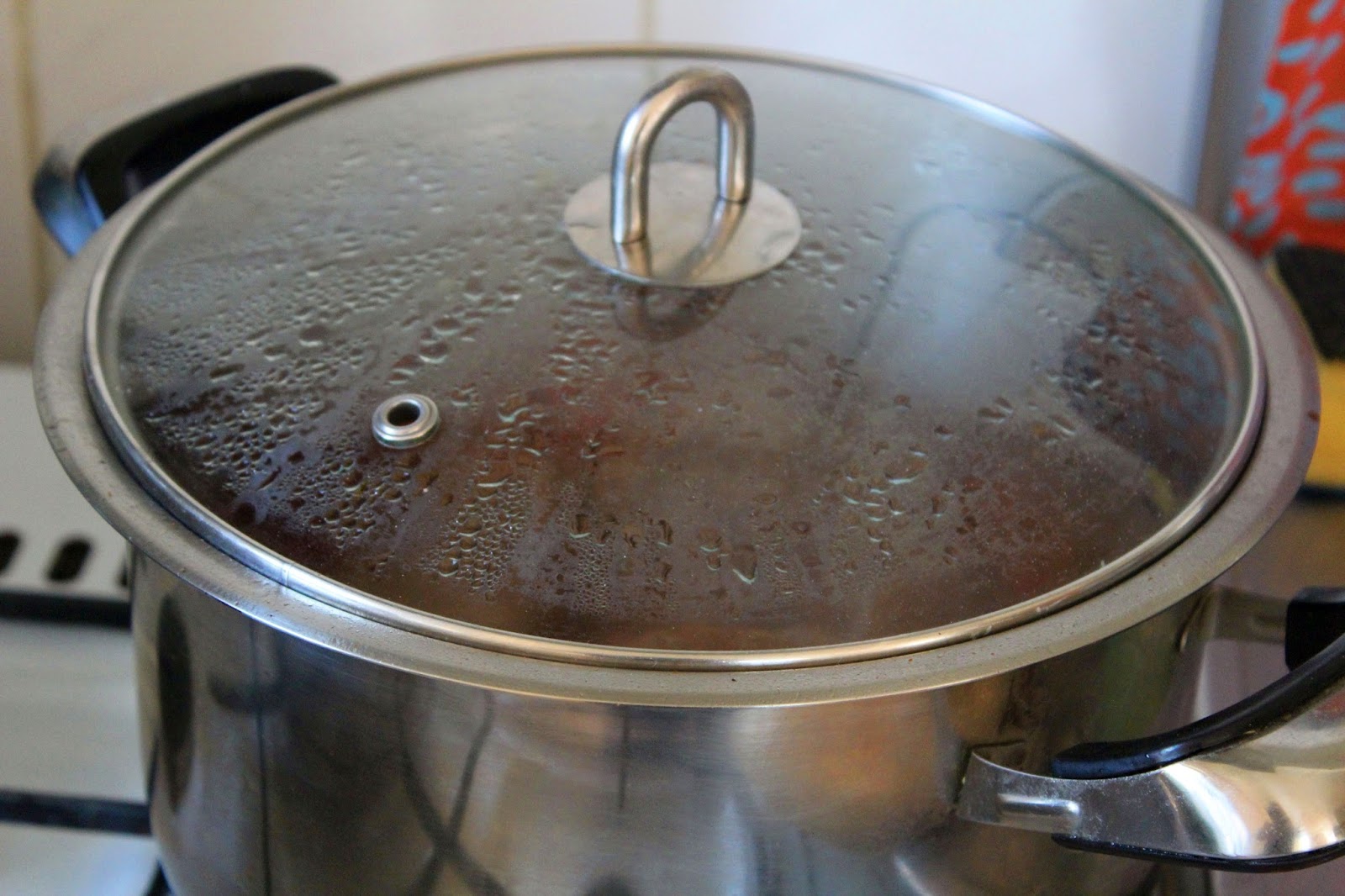Deckel auf den Topf legen, den Topf auf kleiner Flamme erhitzen und wenn der Topfinhalt simmert, die Hitze so gering einstellen, dass dieser Zustand erhalten bleibt. Der Topfinhalt darf nicht sprudelnd kochen, sondern darf nur so vor sich hin simmern.