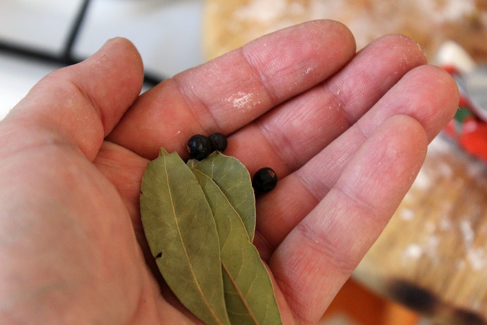 Jetzt noch die elementaren Gewürze zum Schmoren in den Topf werfen. Lorbeerblätter und Wacholderbeeren.