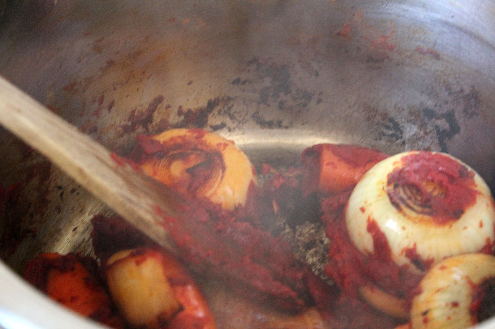 Das Tomatenmark soll nicht schwarz werden, nur braun. Dann ist der Geschmack toll und die Röstaromen können vom Topf abgelöst werden.