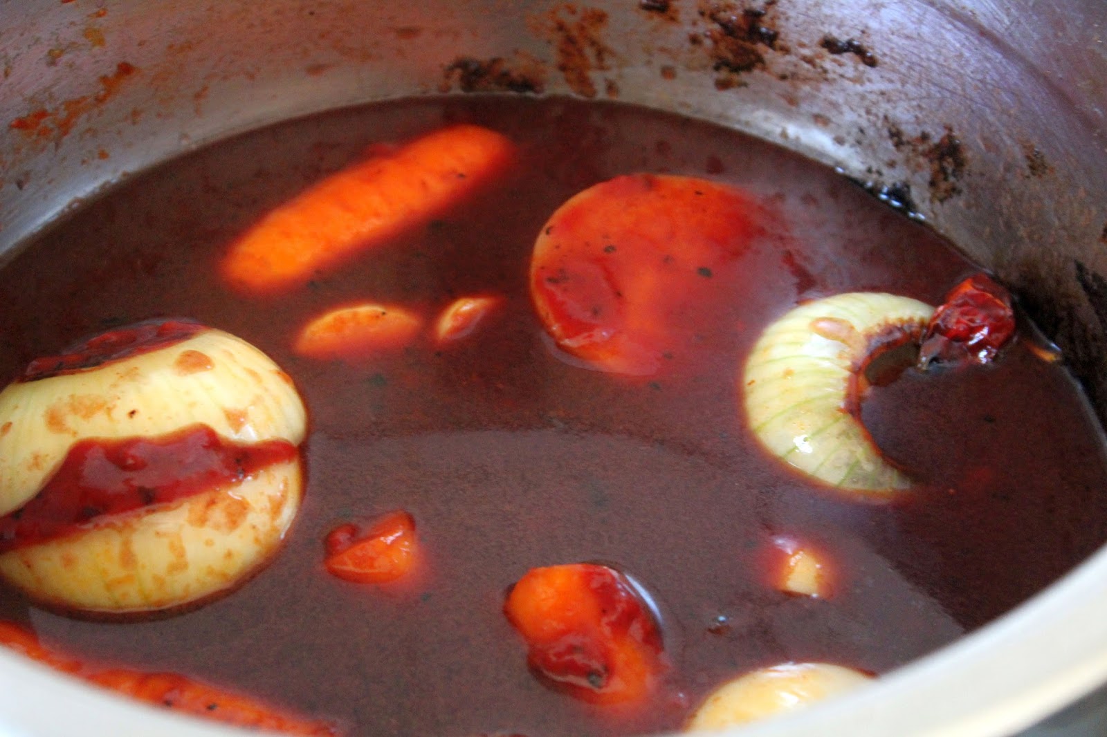 So, es ist vollbracht: Nach ca. 4 1/2 bis 5 Stunden simmern (was bei meiner einfachen Induktionskochplatte nicht gut geht, kocht immer wieder auf, warum auch immer…neue Platte?!?) war ich gespannt wie ein Flitzbogen…. das Suppenfleisch, na ja, kriegt beim Aufwärmen noch mal ne Chance, die Beinscheiben super (nur die “Häute” sind schlimm, aber die Soße….. ich habe nach ca. 4 Stunden das Gemüse raus und dafür dann Rosinen und ein paar Mandelgeraffel rein, ja, wäre mein Topf groß genug gewesen, ich hätte mich reingeschmissen. Ich werd beim nächsten Mal vielleicht nur Beinscheiben nehmen vorher aber das Fleisch rausschneiden und den Rest so mitschmoren und zum Schluss vielleicht mal einen Apfel reinschneiden und als Abschluss einen Schuss Calvados… in der Soße hatte ich ca. 1/2 ltr. Wein…