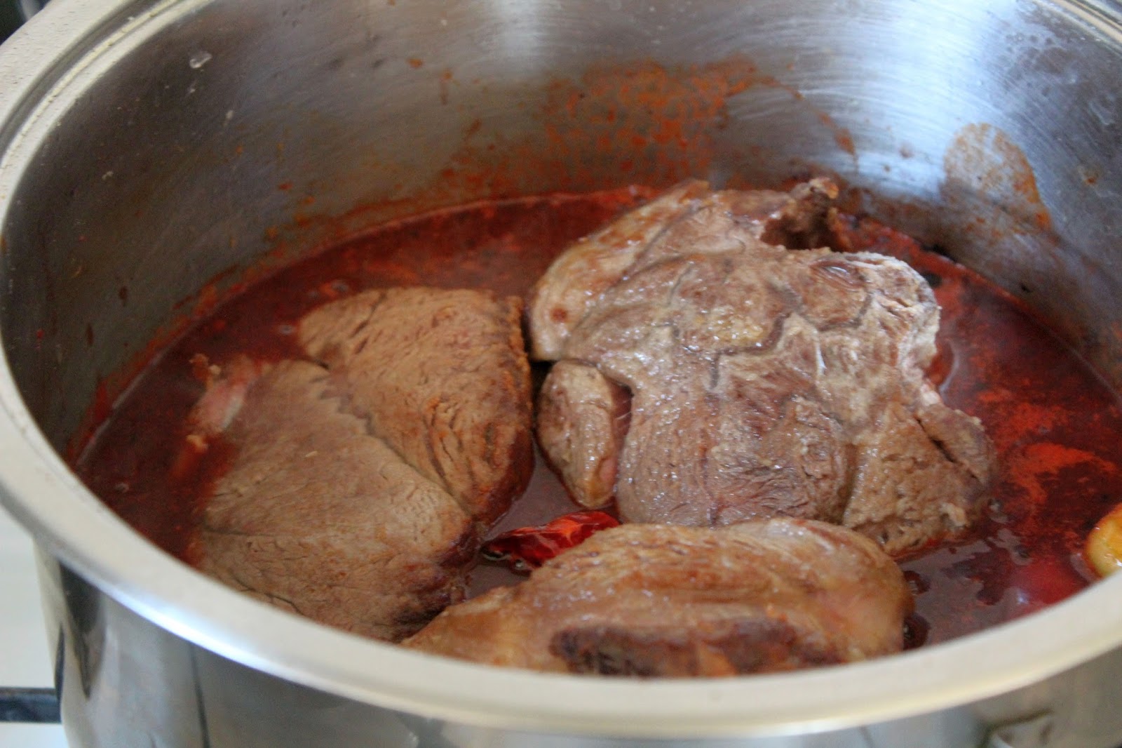 Die erste Stunde muss man gar nichts machen, danach alle halbe Stunde umrühren, oder auch nicht. Das ist total egal. So sieht es nach zwei Stunden im Topf aus. Das Fleisch ist in der Soße eingesunken und simmert absoluter Zartheit entgegen. Man sollte das Fleisch DREI Stunden garen, dann ist es butterzart. Fleisch mit einer langen Faser wie dieses Suppenfleisch, hat die Angewohnheit, dass es erstmal beim Schmoren hart wird. Wenn man es dann probiert, denkt man, dass man alles falsch gemacht hat und den Topfinhalt bestimmt nur noch entsorgen kann. Das muss so! Nach fest kommt zart, wenn man genau so vorgeht, wie oben beschrieben, als auf kleinster Flamme drei Stunden schmoren. Dann ist es eine wirkliche Offenbarung und schmeckt besser als manche kurzgebratene Kostbarkeit.