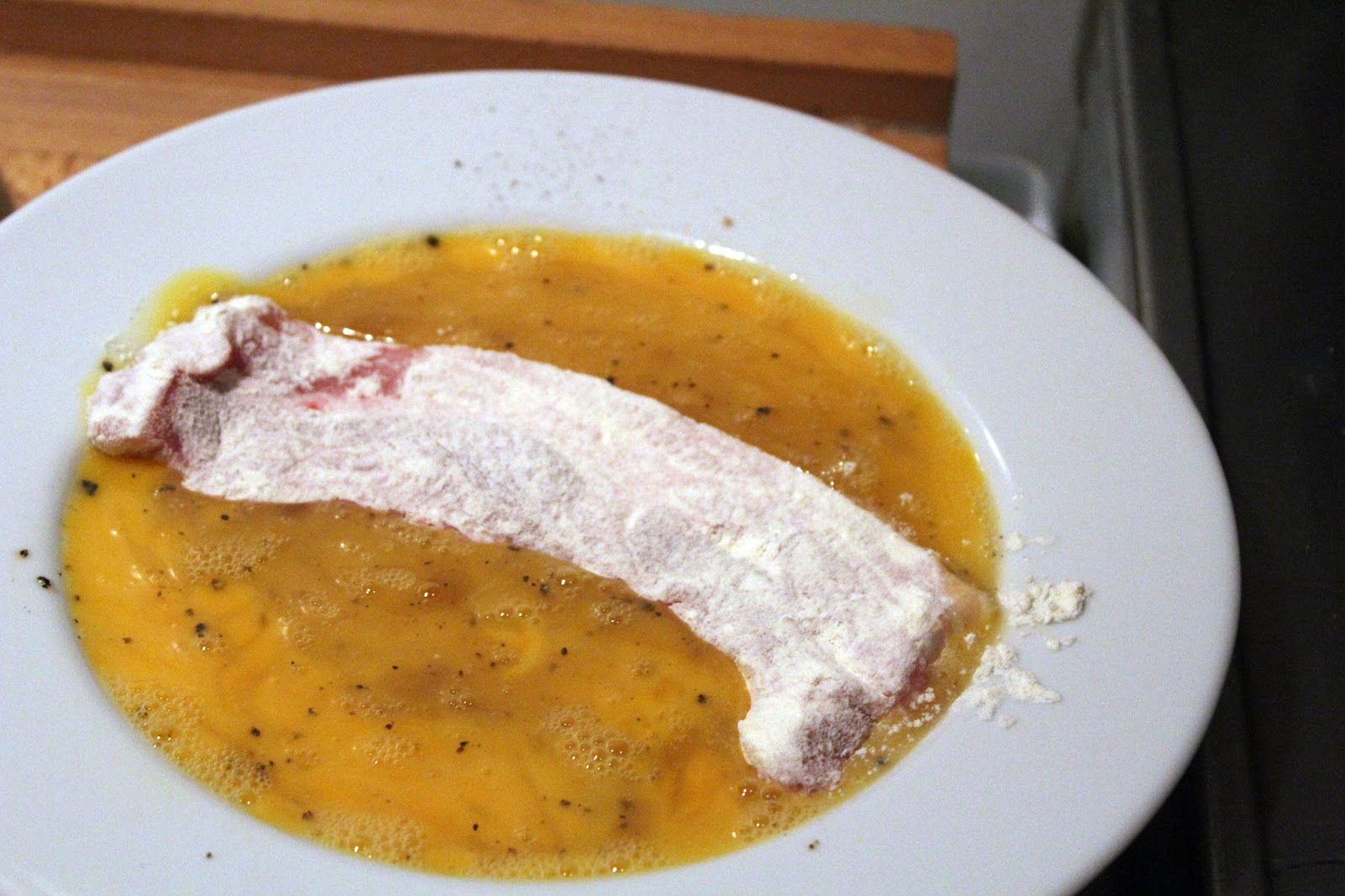 Links kann man die Abschnitte gut erkennen. Falls jetzt jemand sagt, Iiiih ich esse aber kein Fett, dann kann ich das mit meinem Wissen von früher verstehen, aber das ist der Einsicht gewichen, dass man es gut gebraten unter der Panierung gar nicht mehr merkt, dass es ein Geschmacksträger ist und das schiere Fleisch dazwischen vom Fett profitiert, weil es ungleich zarter brät, als wenn es nicht von Fett umschlossen wäre. Ich gebe zu, dass mich diese Einsicht ein paar Dekaden gekostet hat, aber ich lasse Euch gerne daran teilhaben und wenn es Euch noch nicht bei diesem Rezept einleuchtet, kommt das irgendwann später und dann könnt Ihr Euch entsinnen, dass ich das ja schon immer gesagt habe….