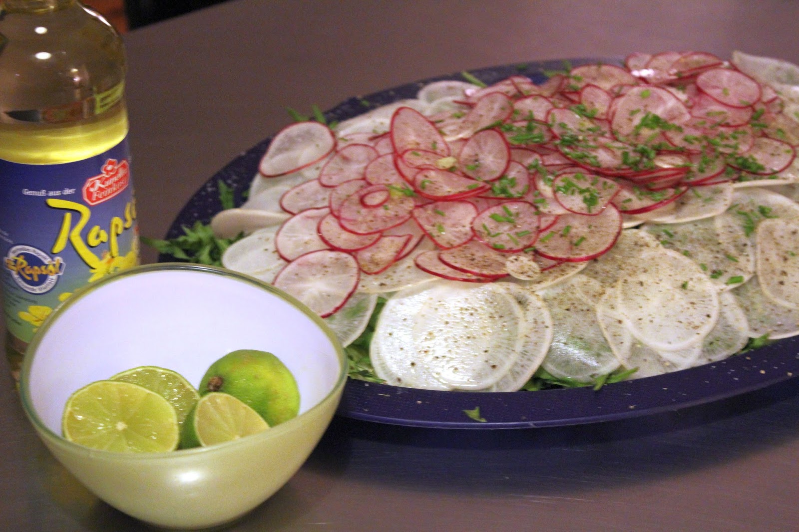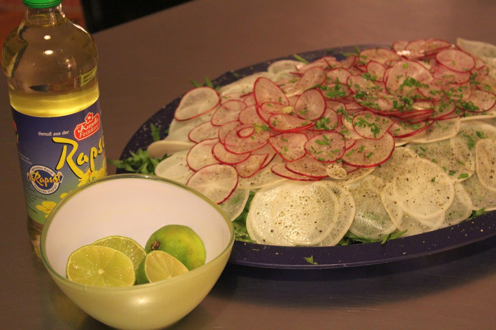 Ich habe die Teller für alle anwesenden angerichtet und später konnte sich dann jeder selbst nachnehmen. Salat auf dem Teller drapieren Mit dem Limettensaft und dem Rapsöl marinieren.