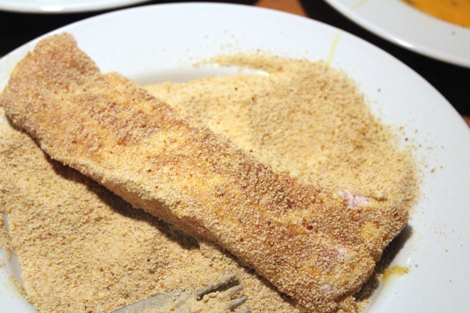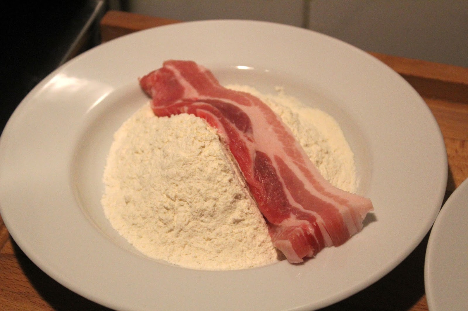 Nun kommt als letzter Arbeitsgang beim Panieren das Bauchfleisch ins Paniermehl. Wenn man merkt, dass die Panierung nicht richtig hält, einfach noch einmal zurück ins Ei und danach erneut ins Paniermehl.