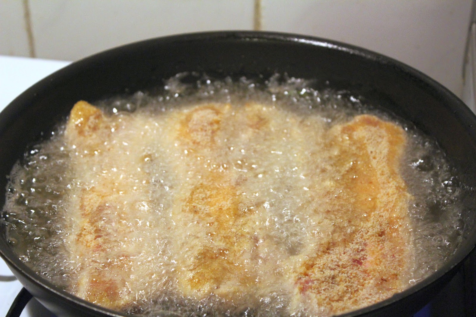 Pfanzenöl in die Pfanne geben. Die Füllhöhe der Pfanne muss so sein, dass das Fleisch zur Hälfte im Öl liegt, wenn es gart. Somit ist gewährleistet, dass es gleichmäßig gart, wenn man es in der Garzeit ein einziges Mal wendet.