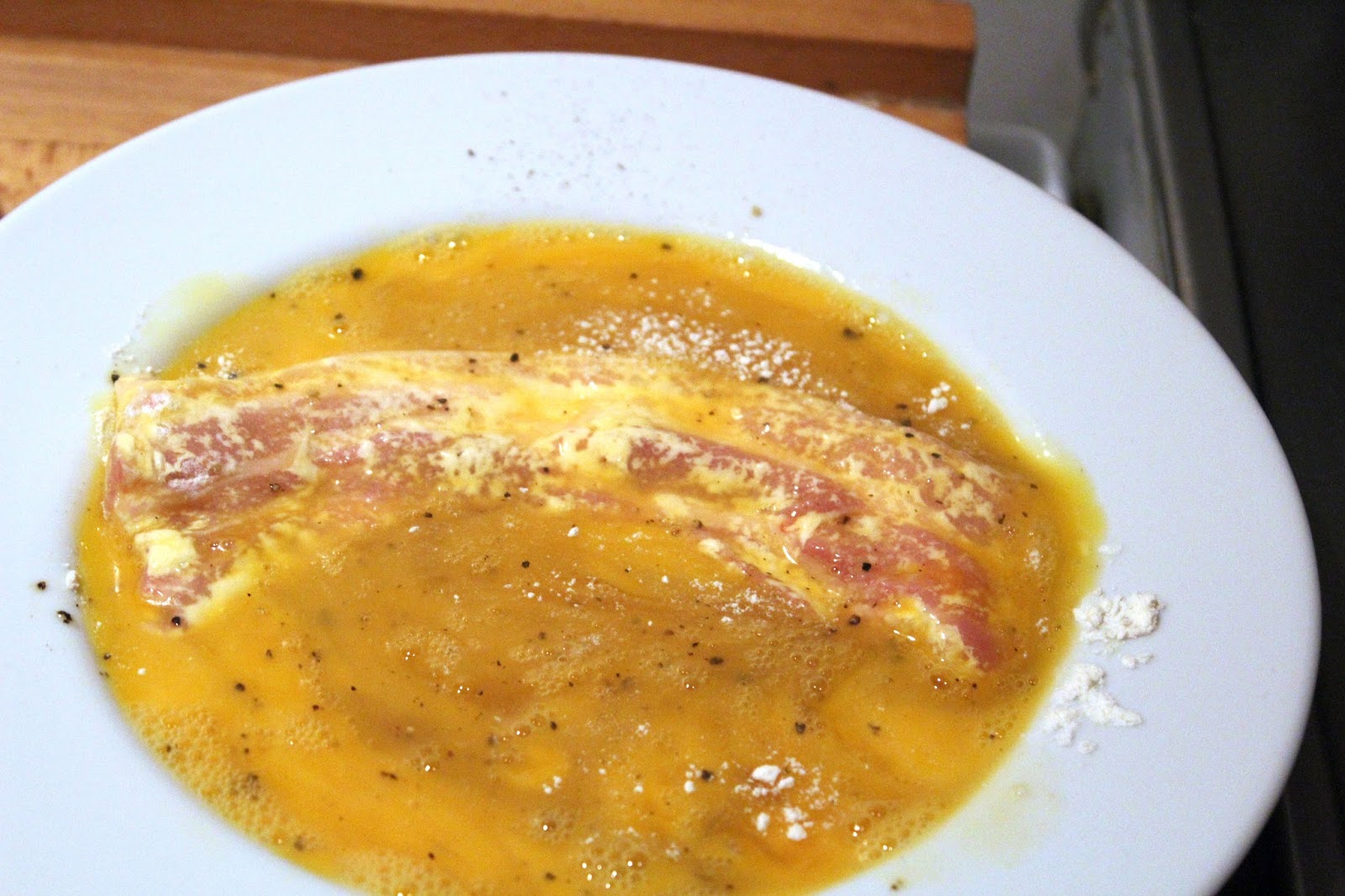 Wichtig ist, dass das Ei lückenlos am Mehl haften bleibt. Nur dann bleibt die Panierung auch am Fleisch.