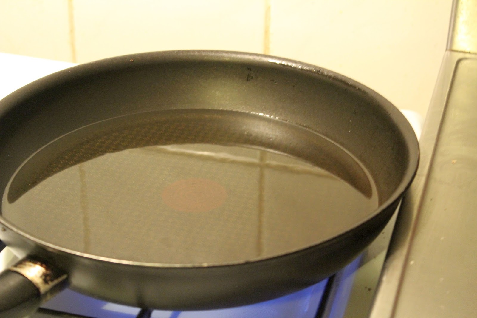 Pfanzenöl in die Pfanne geben. Die Füllhöhe der Pfanne muss so sein, dass das Fleisch zur Hälfte im Öl liegt, wenn es gart. Somit ist gewährleistet, dass es gleichmäßig gart, wenn man es in der Garzeit ein einziges Mal wendet.