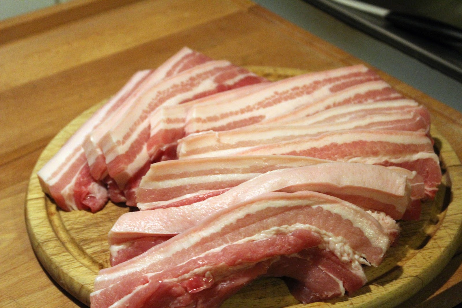 Ich starte damit das Fleisch zum Panieren vorzubereiten. An dem fetten Teil des Fleisches ist noch die Schwarte. Die schneide ich mit einem scharfen Messer ab und koche daraus später eine Brühe, dann kommt die Schwarte auch noch zu Ehren.