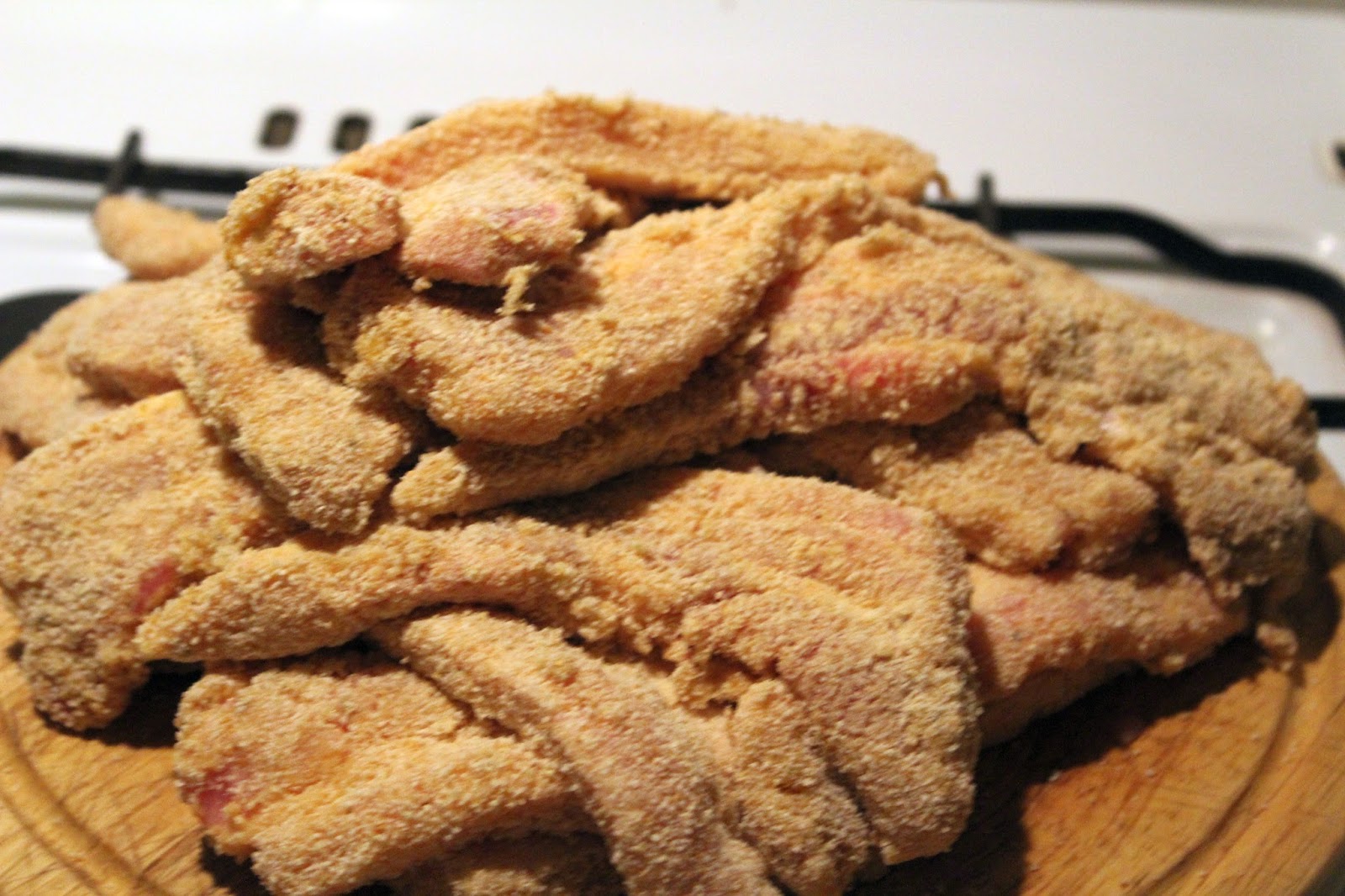 Nun kommt als letzter Arbeitsgang beim Panieren das Bauchfleisch ins Paniermehl. Wenn man merkt, dass die Panierung nicht richtig hält, einfach noch einmal zurück ins Ei und danach erneut ins Paniermehl.