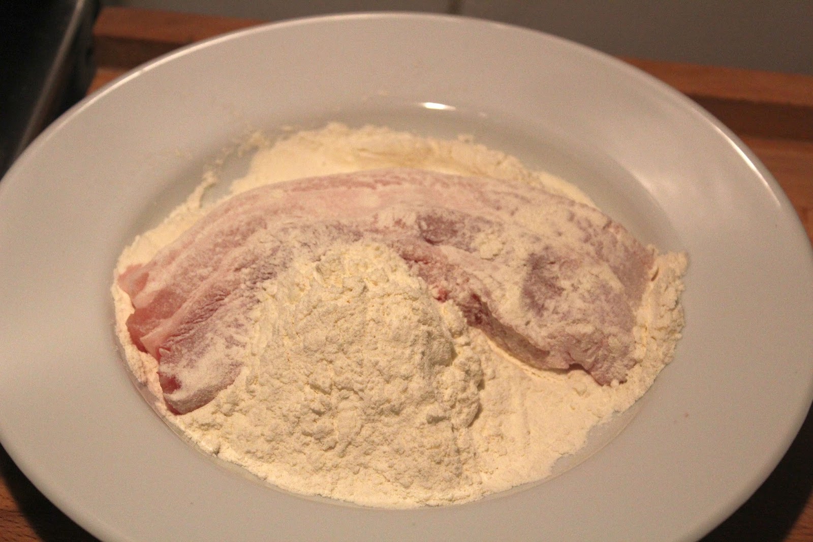 Links kann man die Abschnitte gut erkennen. Falls jetzt jemand sagt, Iiiih ich esse aber kein Fett, dann kann ich das mit meinem Wissen von früher verstehen, aber das ist der Einsicht gewichen, dass man es gut gebraten unter der Panierung gar nicht mehr merkt, dass es ein Geschmacksträger ist und das schiere Fleisch dazwischen vom Fett profitiert, weil es ungleich zarter brät, als wenn es nicht von Fett umschlossen wäre. Ich gebe zu, dass mich diese Einsicht ein paar Dekaden gekostet hat, aber ich lasse Euch gerne daran teilhaben und wenn es Euch noch nicht bei diesem Rezept einleuchtet, kommt das irgendwann später und dann könnt Ihr Euch entsinnen, dass ich das ja schon immer gesagt habe….