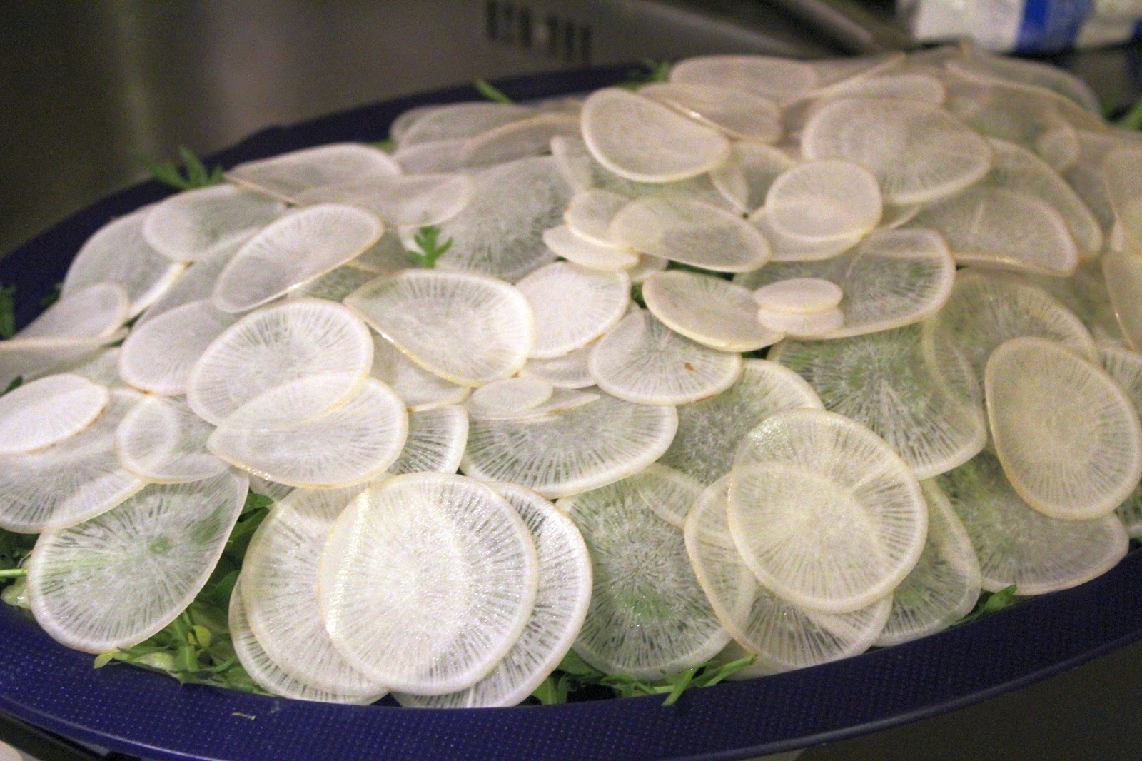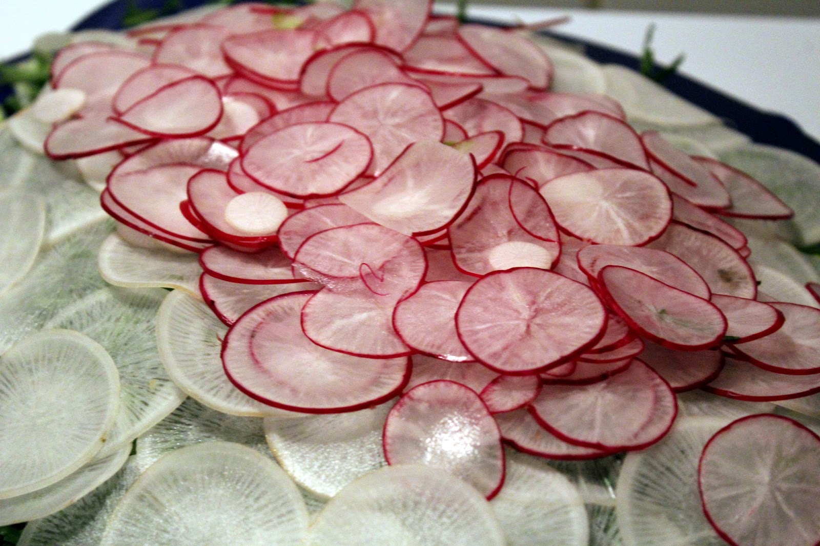 Die Rüben verarbeite ich mit einem Gemüsehobel zu hauchdünnen Scheiben. Damit decke ich den Salat ab.