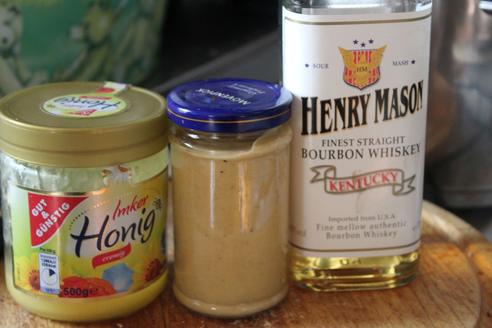 Für die Ästheten vor den Röhrenbildschirmen, hier die Hauptzutaten, Honig und Whiskey mit dem fertigen Senf. Generell sagt man, dass Senf vor dem Servieren drei Tage im Kühlschrank reifen soll. Dann wird er noch ein wenig milder, als frisch gerührt. Beim Reifen geht das Senfmehl auch noch etwas auf. Es kann also auch sein, dass Ihr noch ein wenig Flüssigkeit dazu geben müsst. Da ich meistens nicht drei Tage vorher weiß, was es zu essen gibt, sondern mir sowas spontan ausdenke, gibt es bei mir in 99 % die volle Breitseite an Schärfe. Mit dem Senf habe ich letzten Samstag ein paar schärfefremde Ostgaumen gegrillt. Oh zu scharf, nimm erstmal nen Schluck prickelndes Mineralwasser, oooops, doch lieber eine Milch… 😉