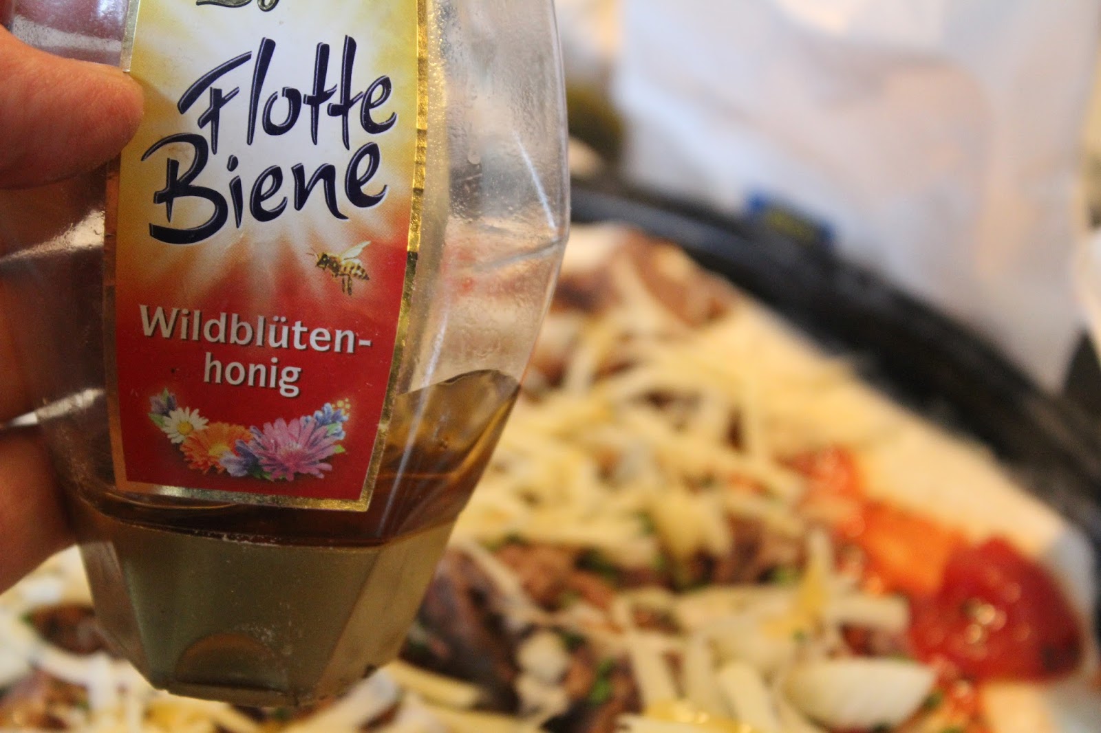 Dafür könnt Ihr mir jetzt wieder auf die Fresse hauen, weil ja immer irgendwas und das kein superduper Biohonig aus eigener Imkerei ist. Davon habe ich zugegebenermaßen keine Ahnung und nur wenig Leidenschaft. Noch ein wenig Honig auf der Pizza versprenkeln. Das ist richtig gut für den perversen Geschmack des fertigen Produktes, wenn die Pizza aus dem Ofen kommt.