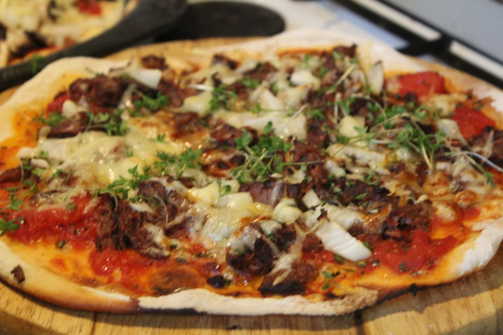 Der Teig ist kross gebacken, der Käse gut geschmolzen und dadurch, dass ich nur Unterhitze im Ofen habe, ist das Fleisch nicht totgegart. Lasst die Finger von Oberhitze beim Pizzabacken. Das soll kein Keks und kein Zwieback werden, sondern Pizza. Wenn die im Steinofen gebacken wird, gibt es auch keine Oberhitze.