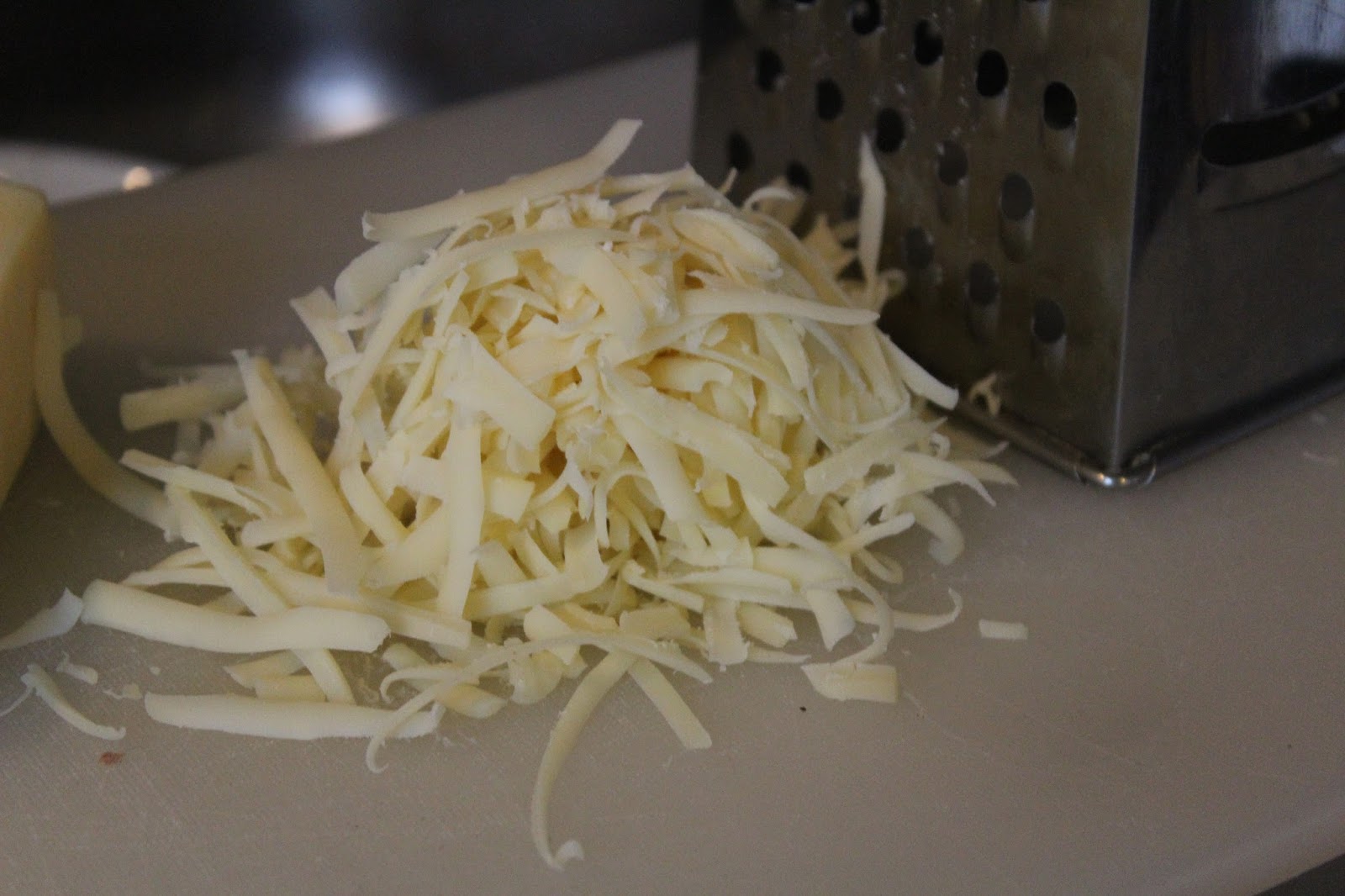Edamer vom Block mit der Standreibe reiben. Ich reagiere hiermit auf das ständige Gedisse, dass ich in den Anfangszeiten meines Blogs auch Reibekäse verwendet habe. Kochen ist ein ständiger Lernprozess und deswegen habe ich jetzt immer ein Kilo Käse im Kühlschrank und reibe das im Bedarfsfall selbst. Das ist übrigens auch günstiger, als sich fertig geriebenen Käse in der Tüte zu kaufen.