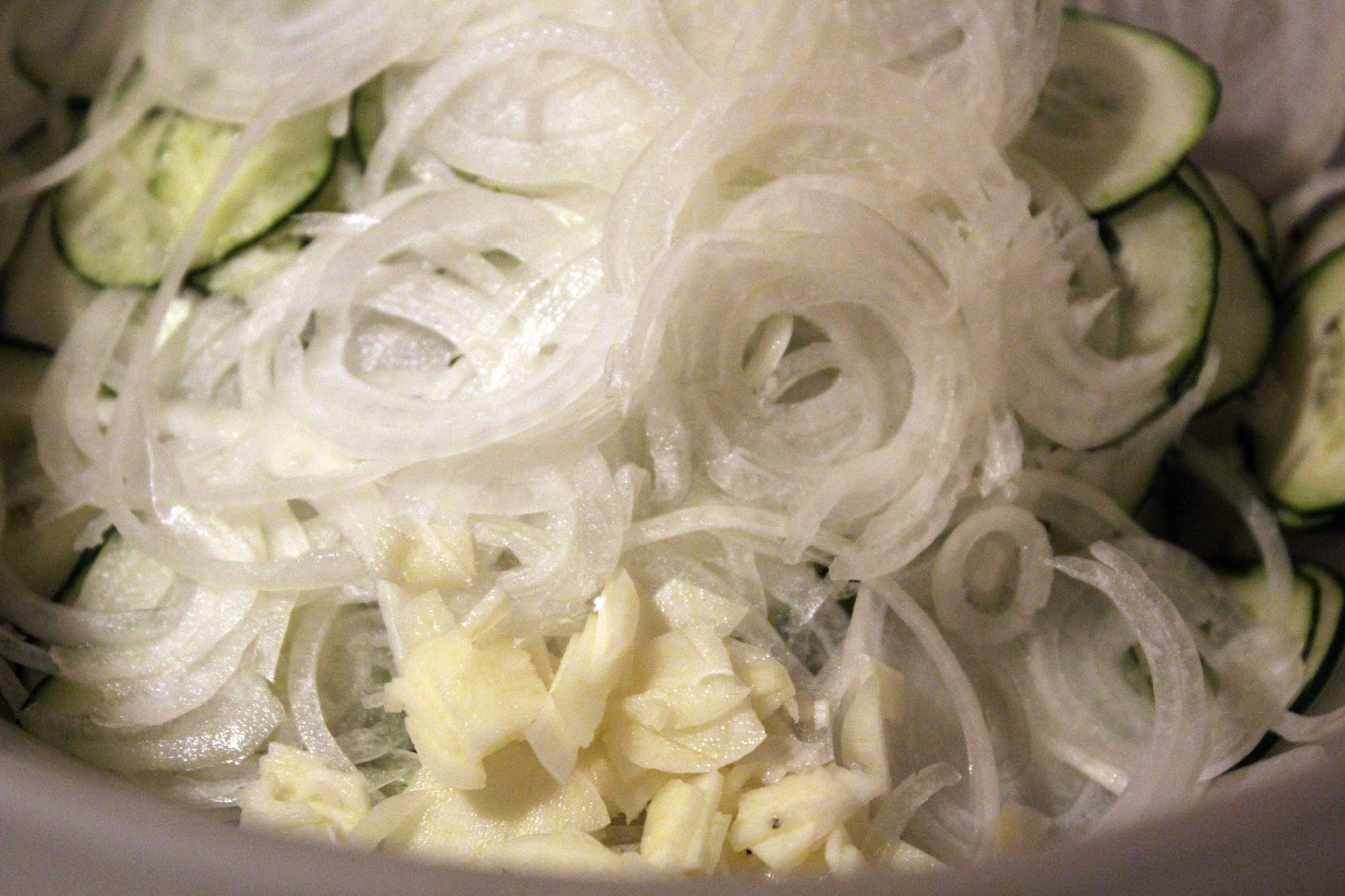 Die Zwiebeln kommen auch zu den Gurkenscheiben in die Schüssel.