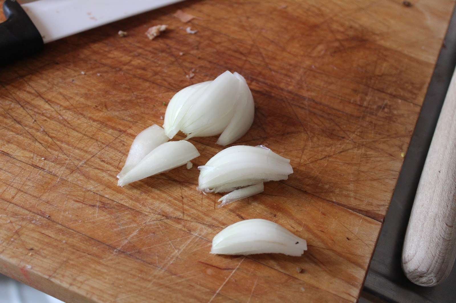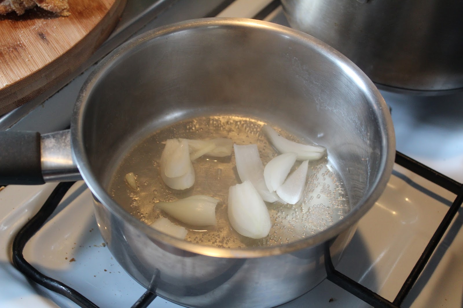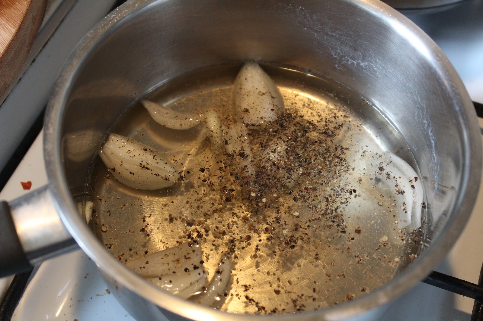 Jede Hollandaise startet mit einer Reduktion, Zwiebel zerkleinern.
