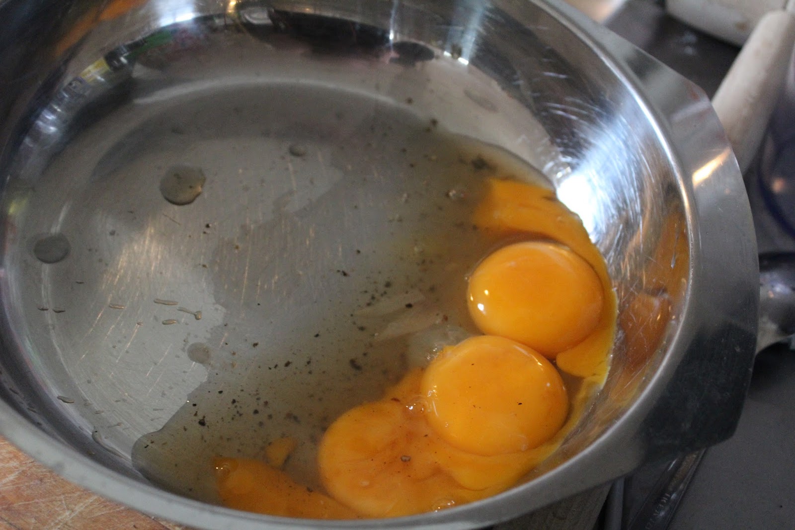 Vier Esslöffel Reduktion zu den Eiern geben.