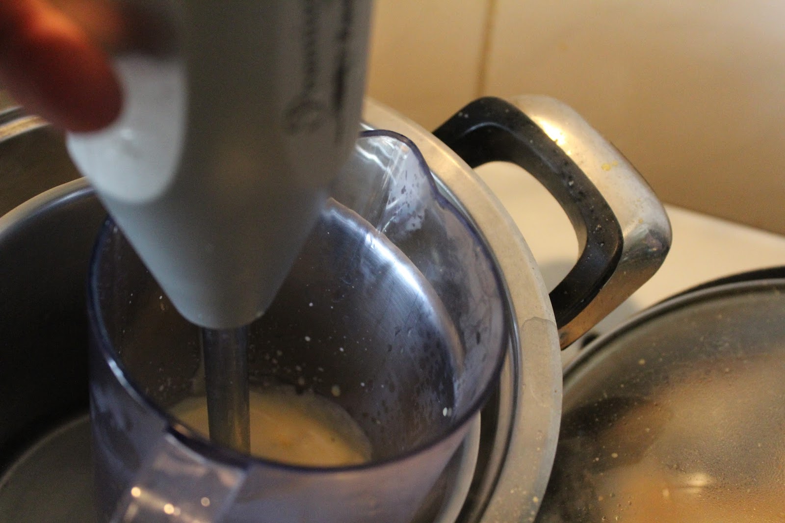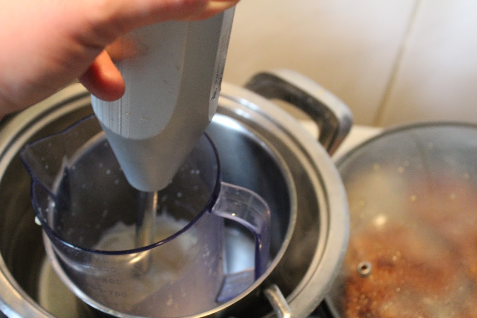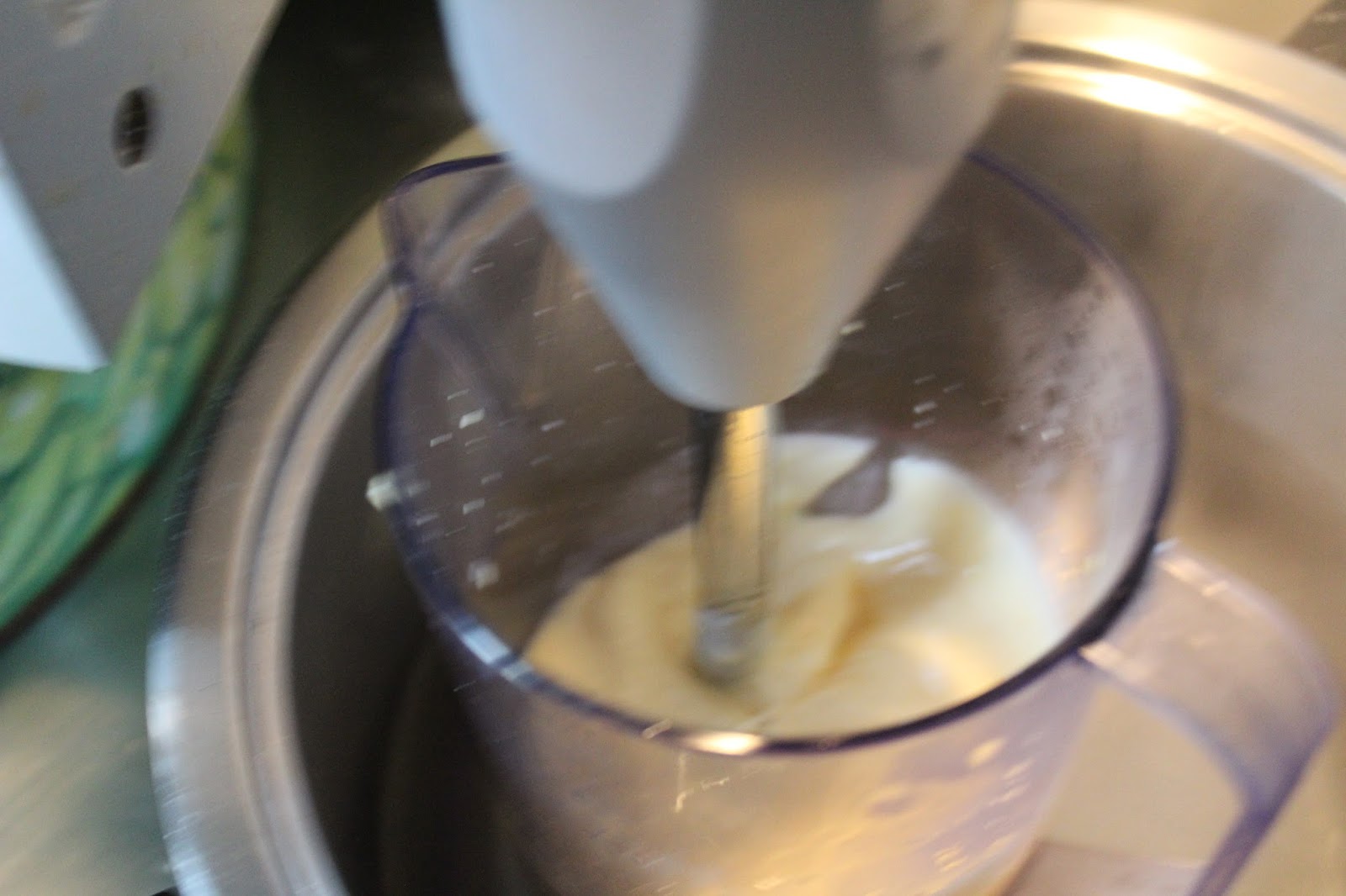Jetzt fülle ich die Eimasse in einen Mixbecher ein und stelle den ins Wasserbad (Herd abstellen) Immer volle Pulle weiter den Zauberstab laufen lassen und nach und nach das geschmolzene Kokosfett einlaufen lassen. Wer Butter hat, nimmt dann eben Butter. Immer nur soviel Fett nachlaufen lassen, dass es sich mit der Masse verbindet, wie beim Herstellen einer Mayonnaise. Zwischendurch probieren und salzen, das fehlt bislang nämlich noch.